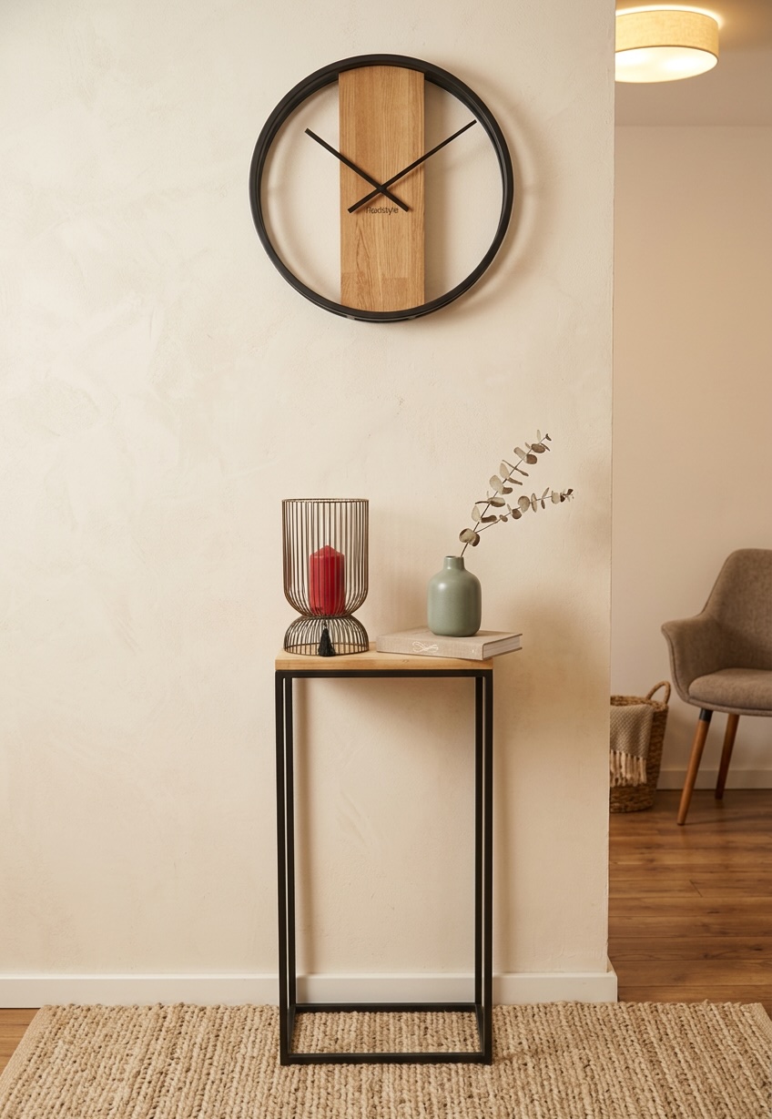 Black furniture console with oak shelf. A product for demanding customers looking for a product made with the utmost attention to detail. The loft console, thanks to its small depth (20 cm), will work even in a small room. Perfectly harmonizes with our oak wall clocks.