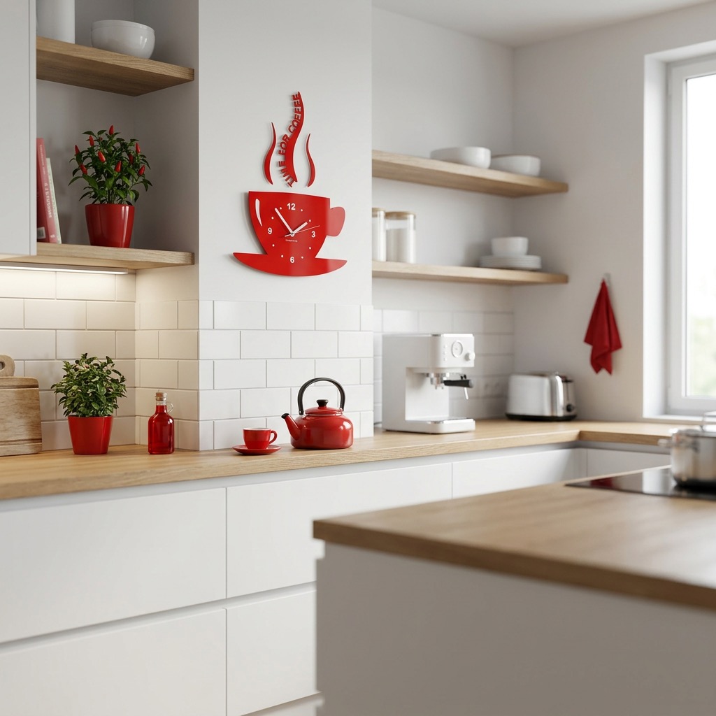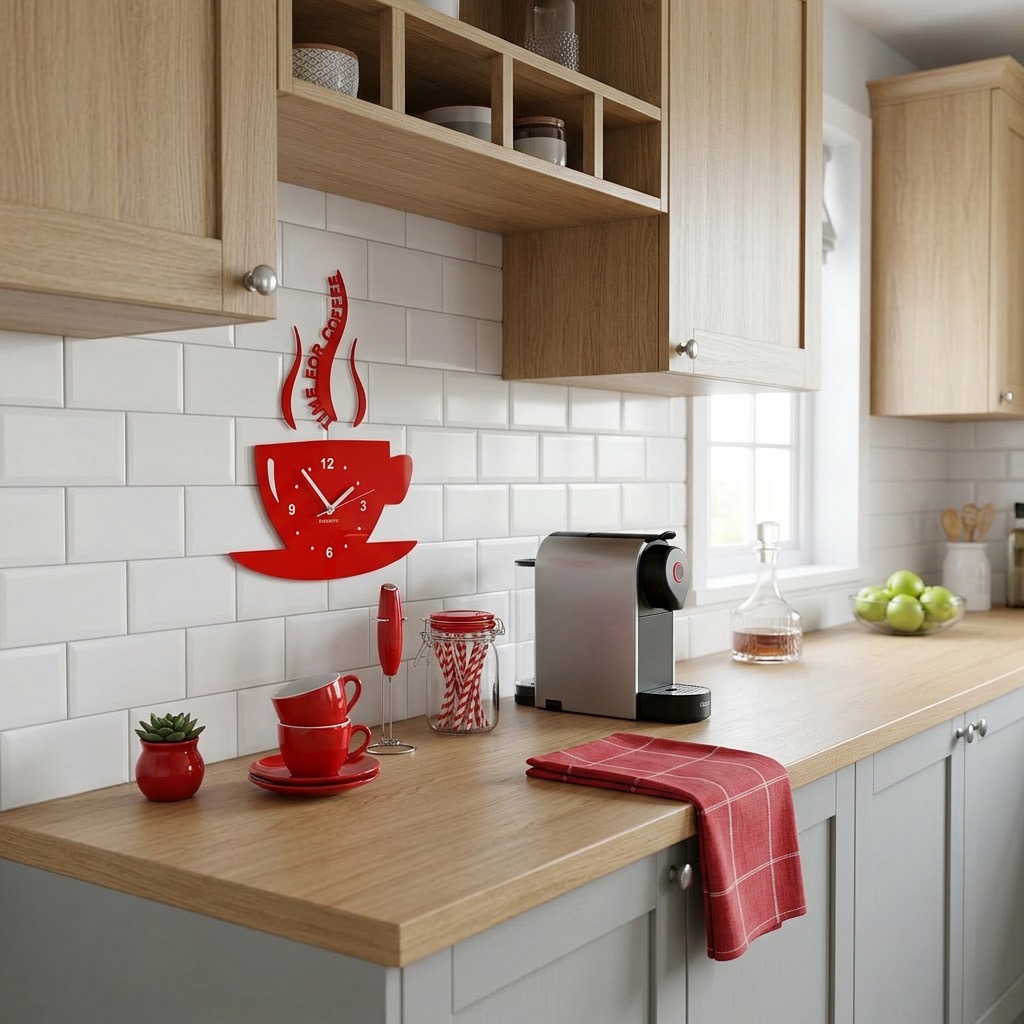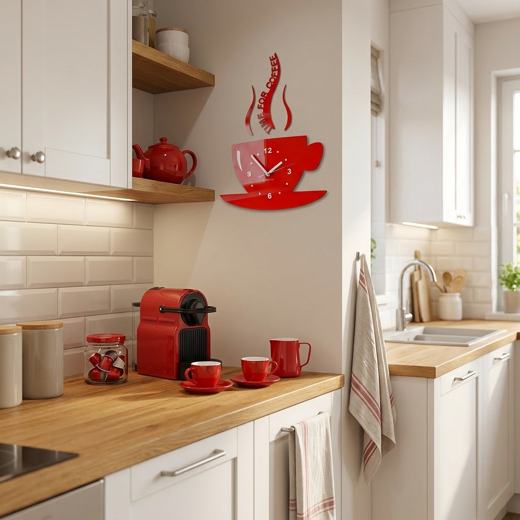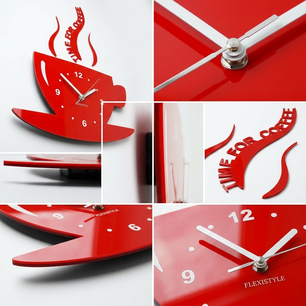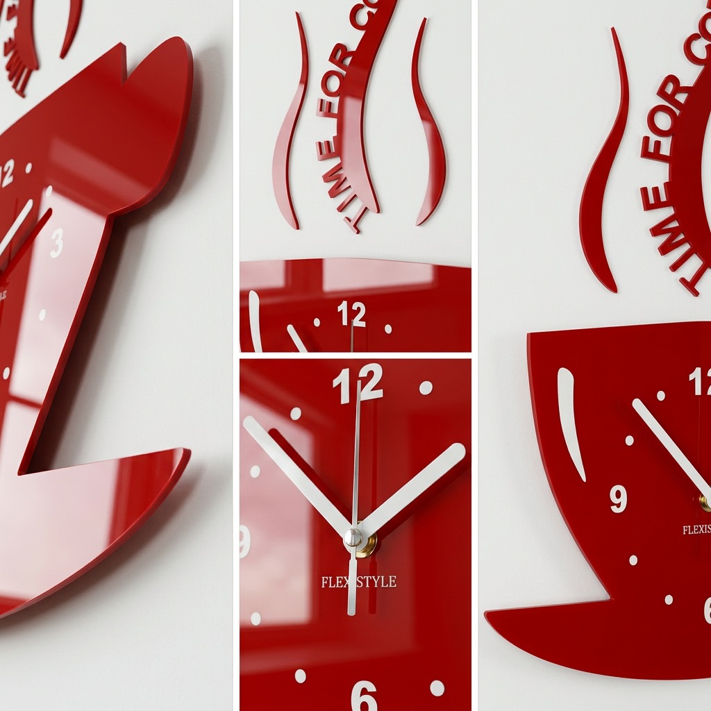 Add a unique touch to your kitchen with the modern wall clock in the shape of a coffee cup from FLEXISTYLE. This kitchen clock is not only a practical timekeeping solution but also a stylish wall decoration that instantly catches the eye.