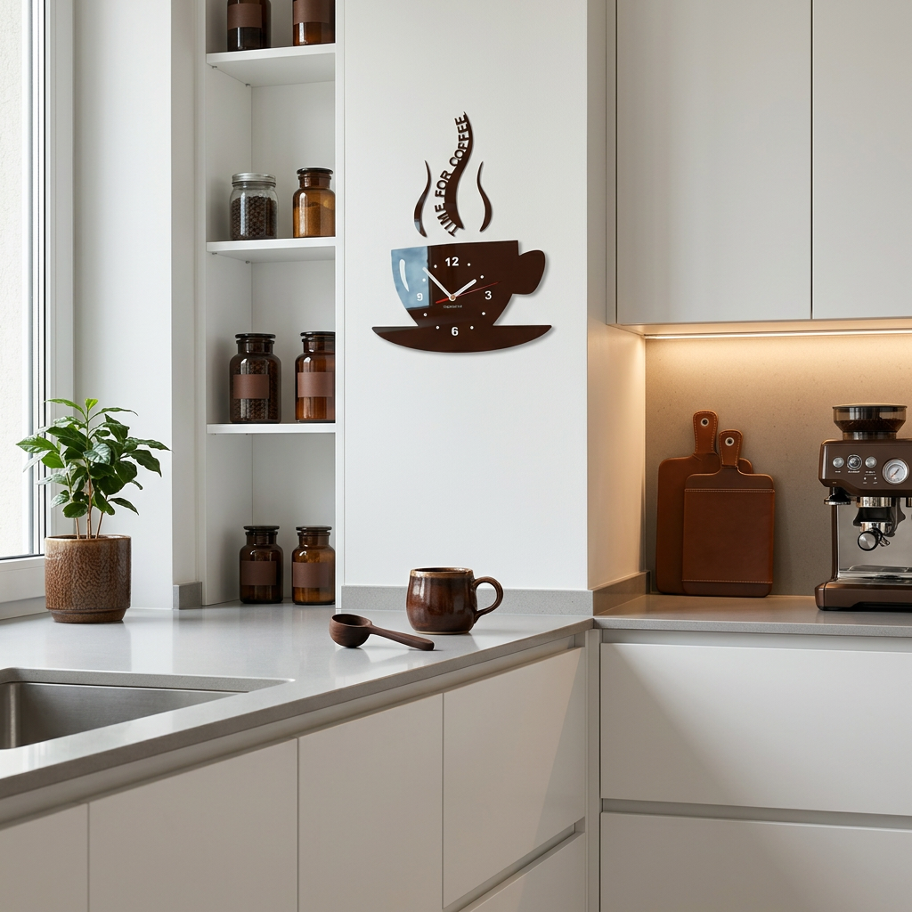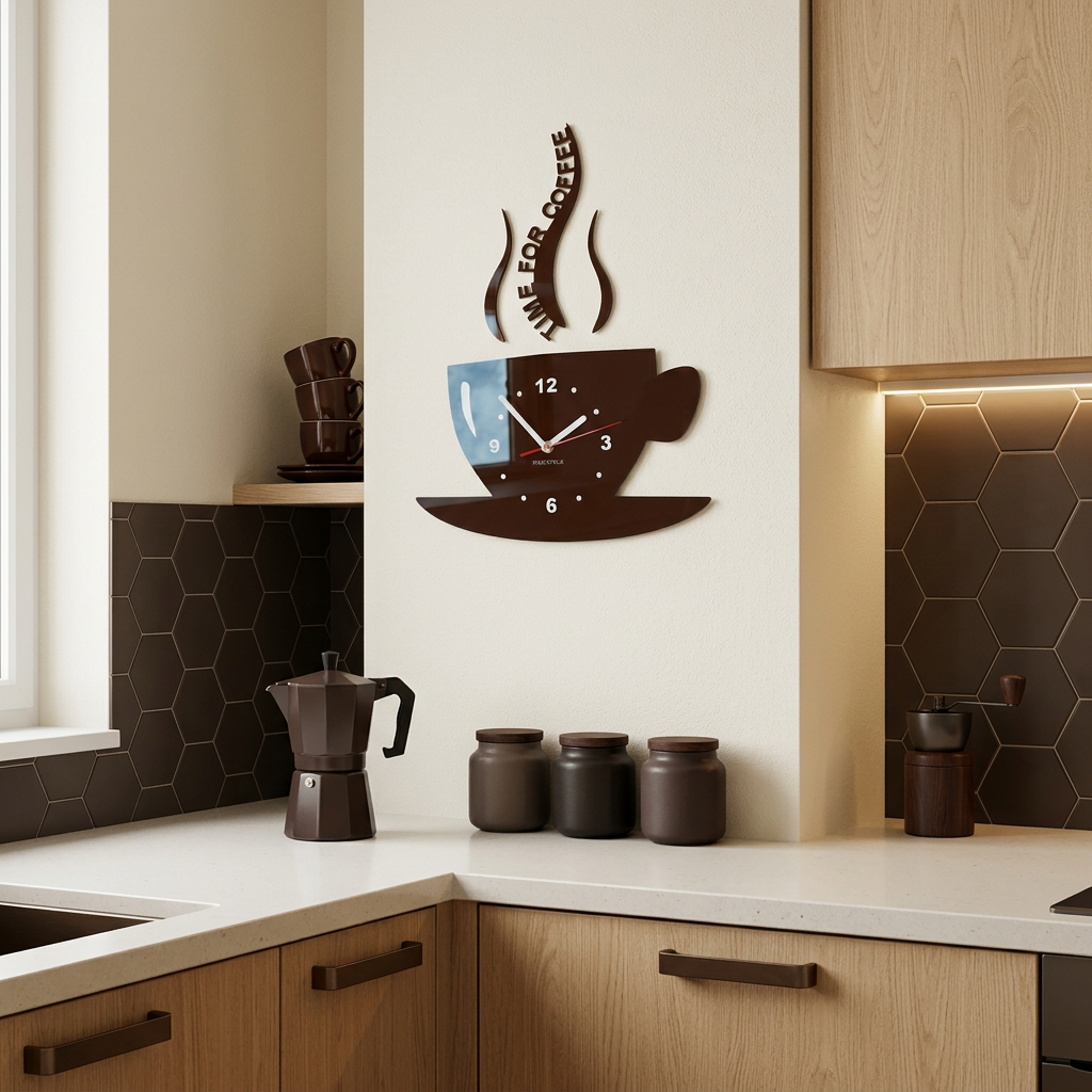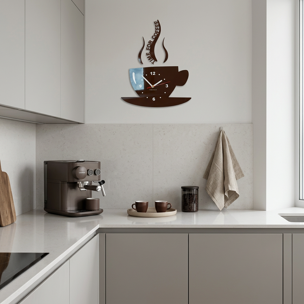 This modern kitchen wall clock in a coffee cup shape combines functionality with decorative style. Ideal for kitchens, dining areas, or cafés, adding a cozy and stylish touch to any space.