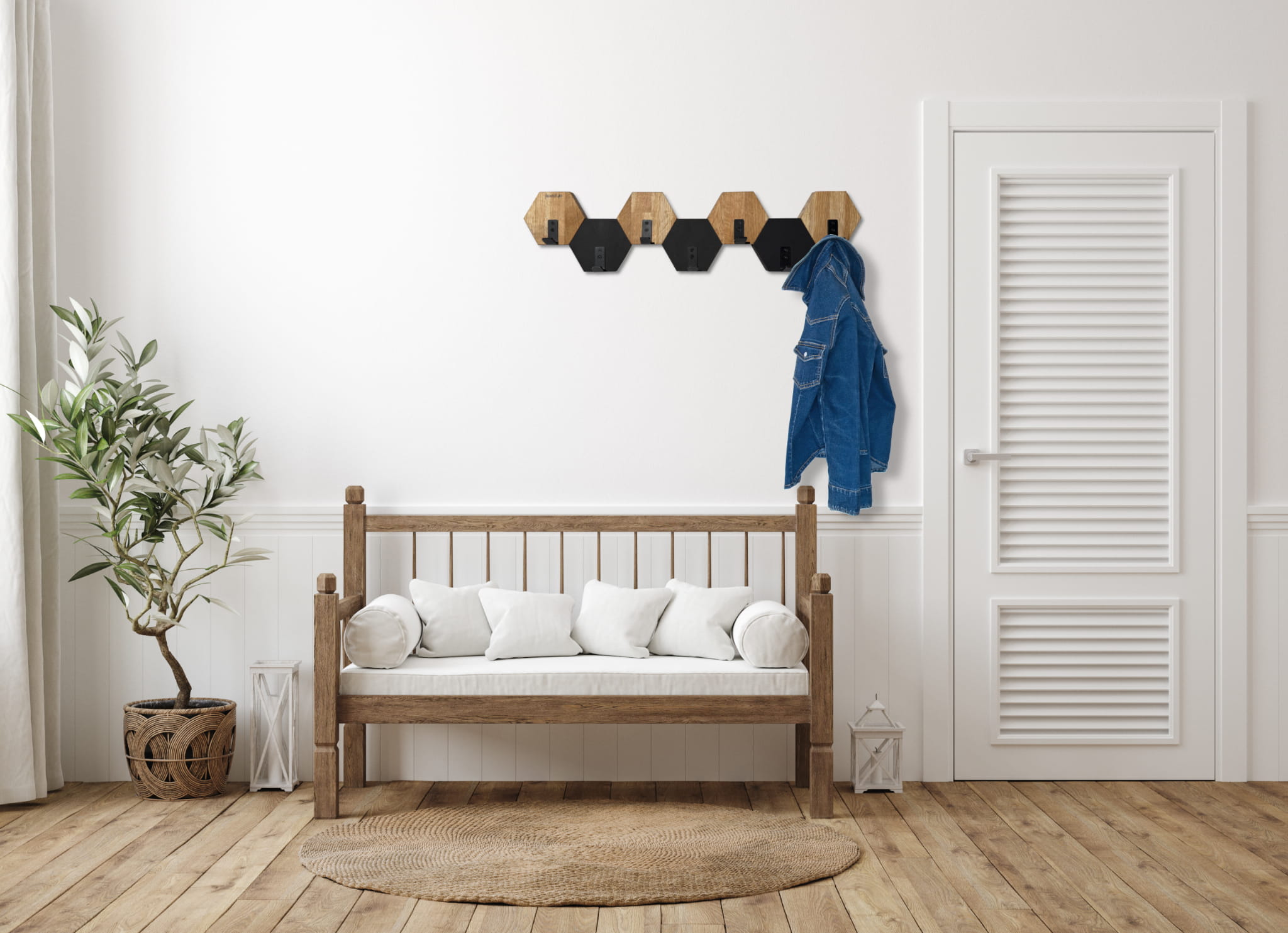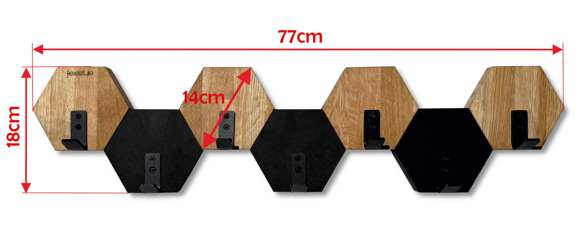 - Unique Design: Wall hook consisting of 7 hexagons, alternately made from oak wood and black, dyed-through MDF.