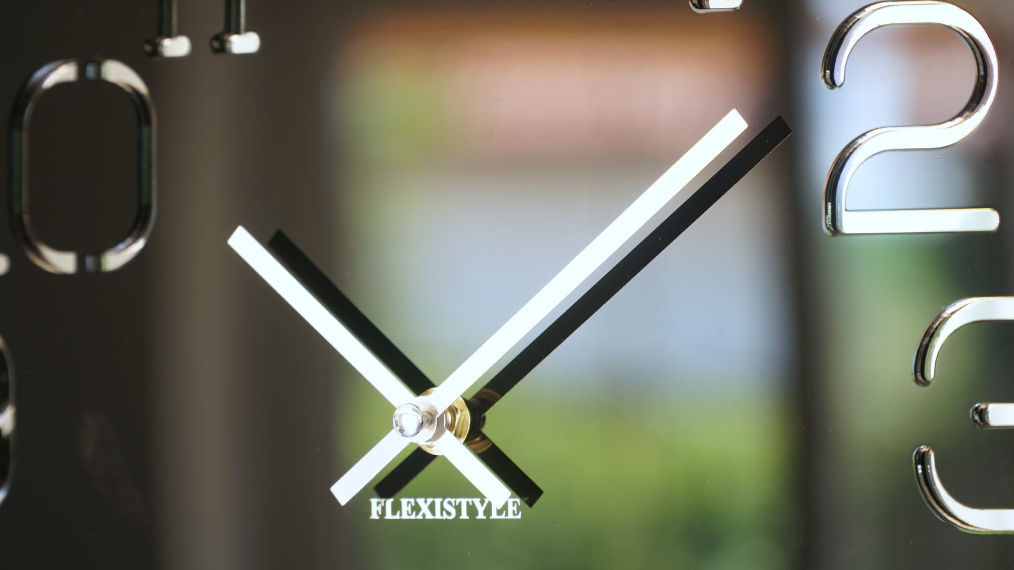 Square black wall clock. High gloss acrylic glass clock face. The bottom layer is an acrylic mirror that subtly shines through the numbers cut in black acrylic. The modern design of the clock makes it a perfect decoration for a living room, bedroom or a modern office.