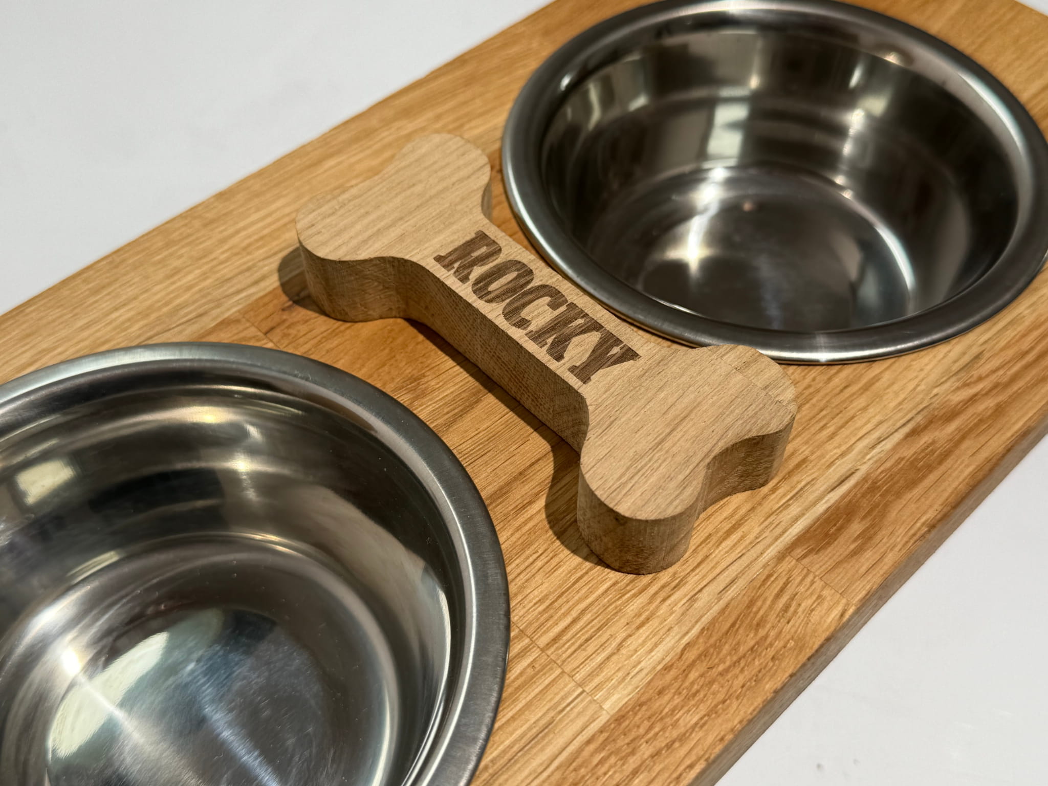 Dodaj wyjątkowy akcent do misek swojego pupila dzięki grawerowanej dębowej kości! Wykonana z solidnego drewna dębowego, elegancka i trwała ozdoba, która idealnie pasuje do naszych stojaków na miski.