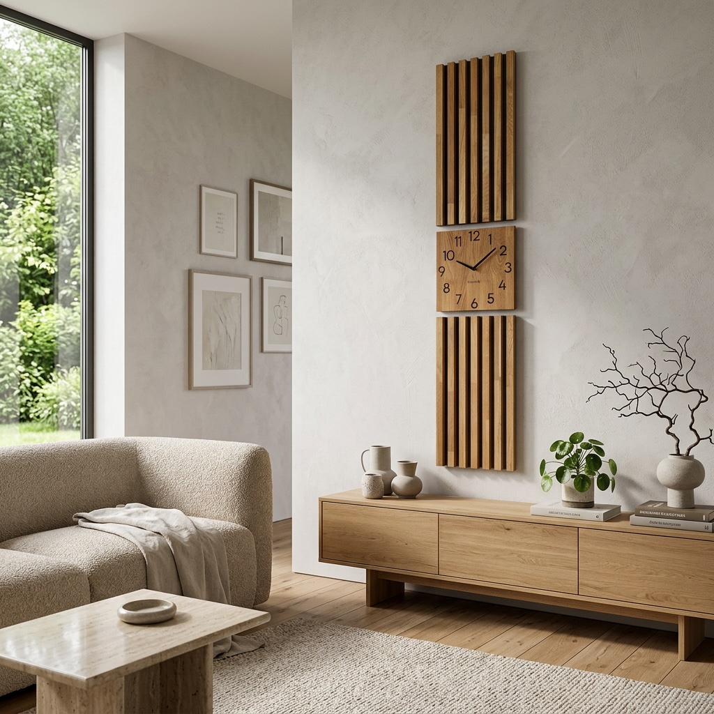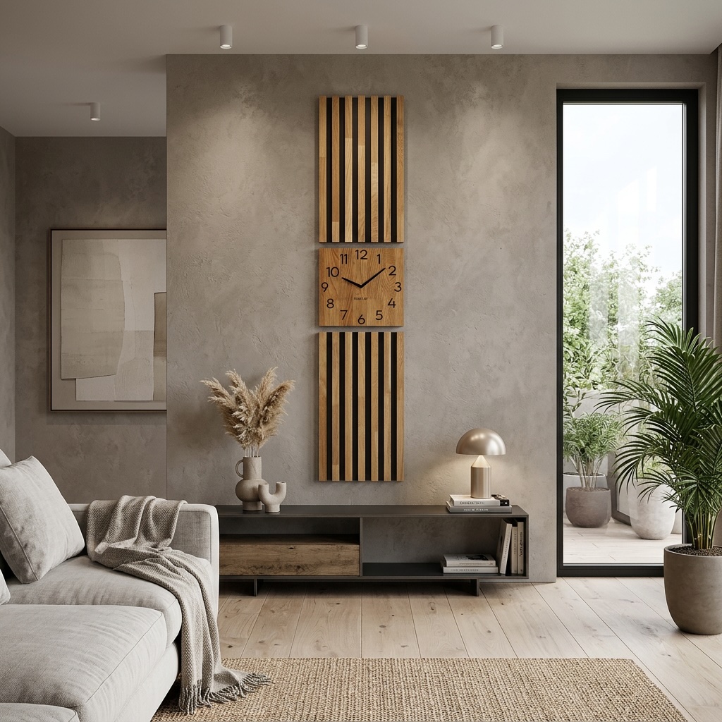 Sama dekoracja składa się z 3 niezależnych dekoracji. Od góry i od dołu znajdują się panele z lamelami, a w środku umieszczony został kwadratowy zegar ścienny. W przeciwieństwie do ogólnodostępnych lameli nasz produkt wykonany został z prawdziwej klejonki dębowej. Dotyczy to zarówno lamel, jak i samego zegara. Lamele zamontowane zostały na czarnym MDFie.