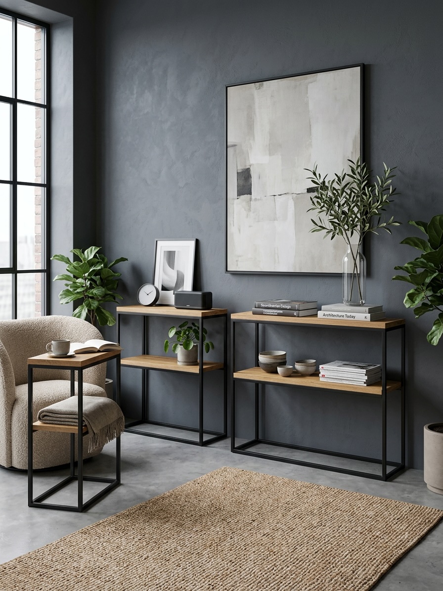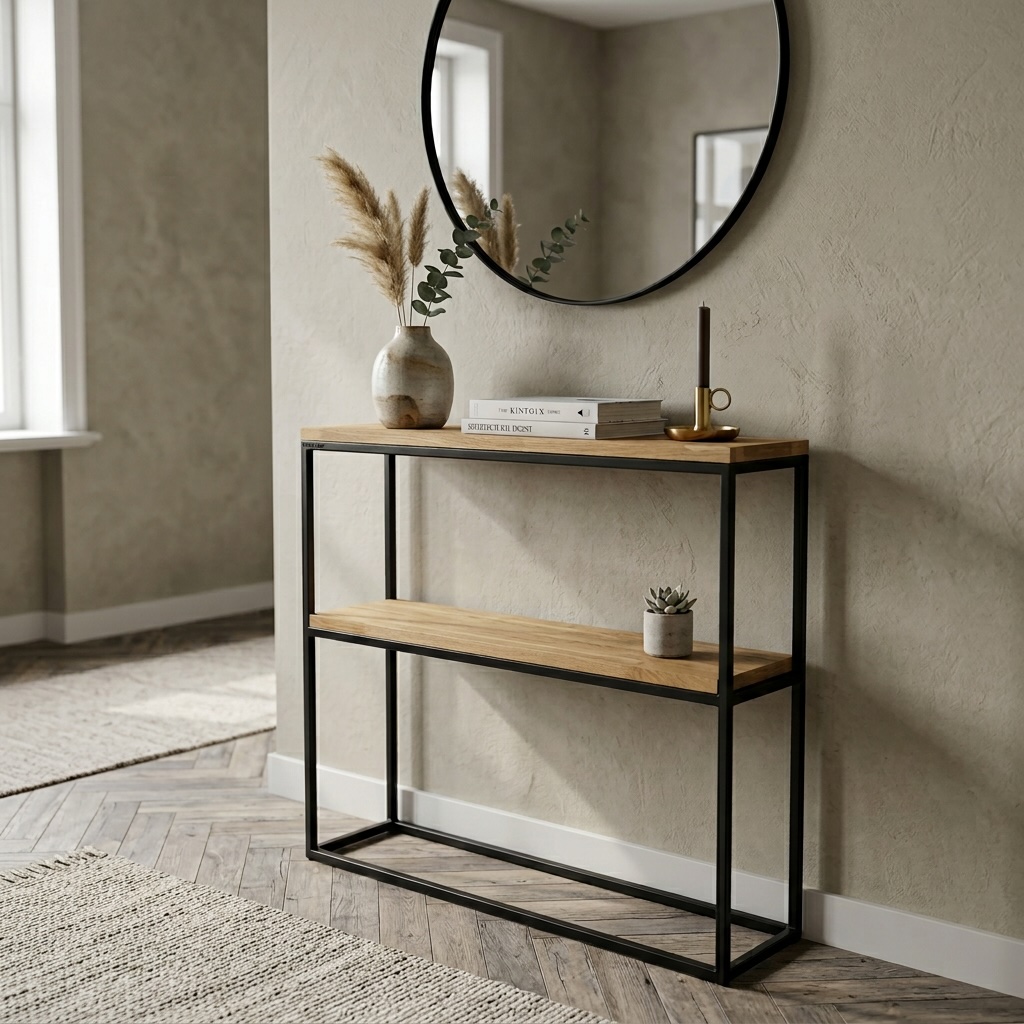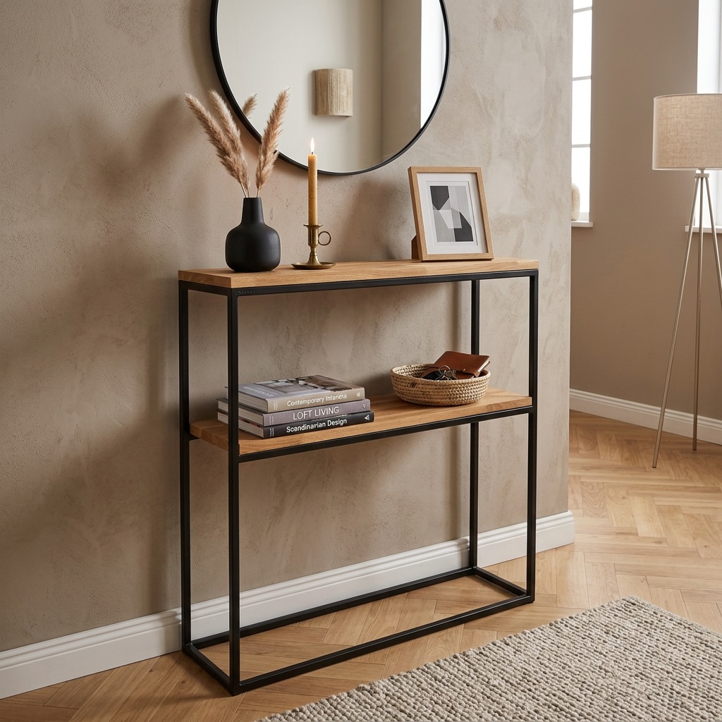 Z dumą prezentujemy naszą ekskluzywną konsolę loftową, idealną do nowoczesnych wnętrz. Ta podwójna konsola zachwyca nie tylko unikalnym designem, ale również solidnością wykonania, co sprawia, że doskonale wpisuje się w estetykę stylu loftowego.