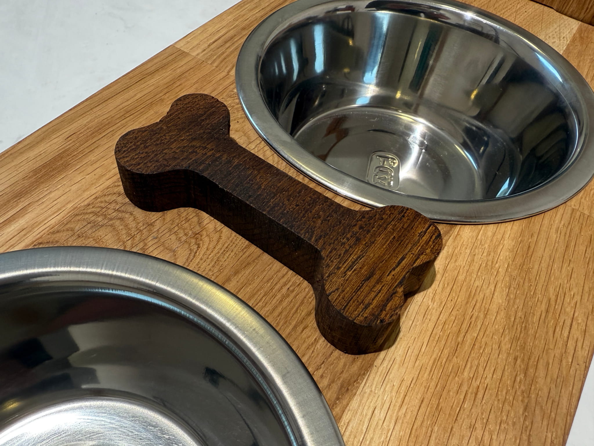 W zestawie: 2 miski ze stali nierdzewnej, dębowy stojak