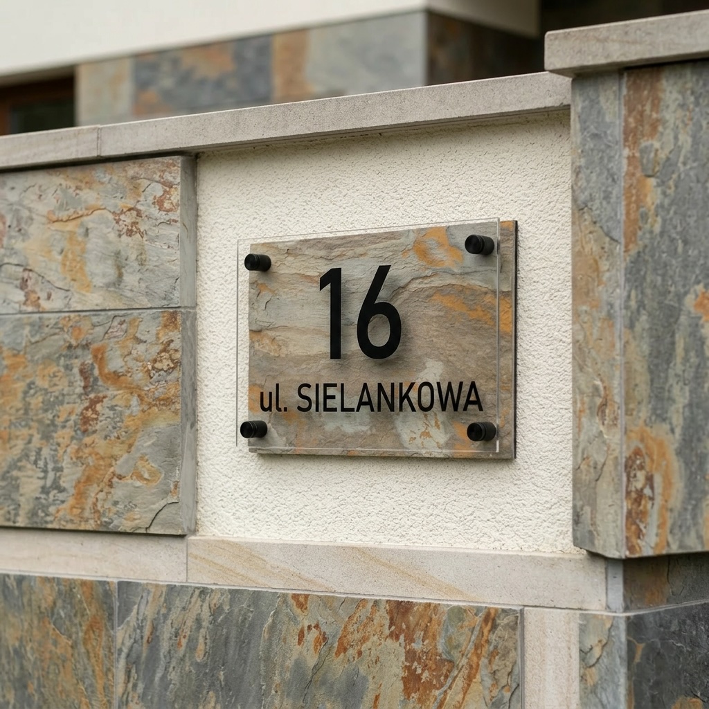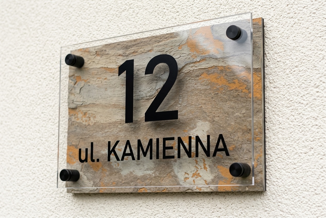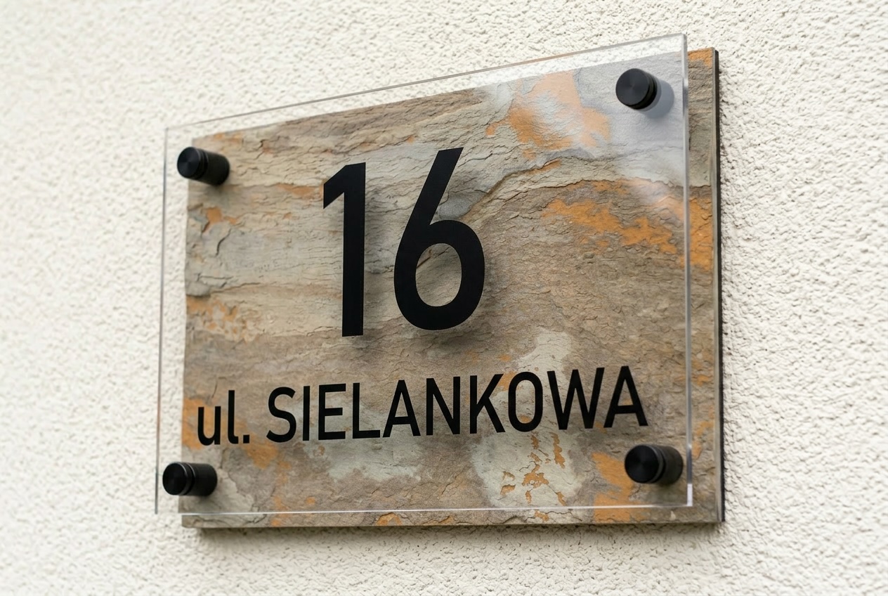 Na froncie znajduje się transparentna płyta z plexi, zamocowana na eleganckich dystansach, które tworzą efekt głębi i lekkości. Czarne, wyraźne oznaczenia numeru oraz nazwy ulicy kontrastują z naturalnym tłem, zapewniając doskonałą czytelność.