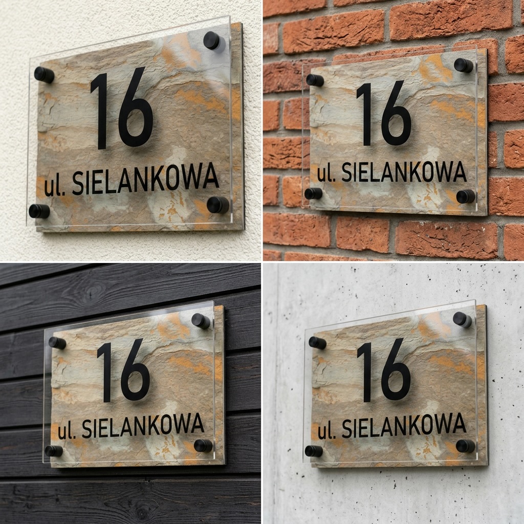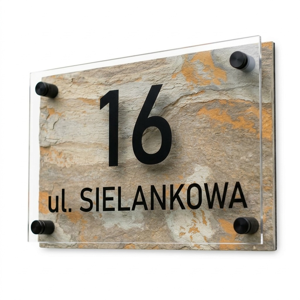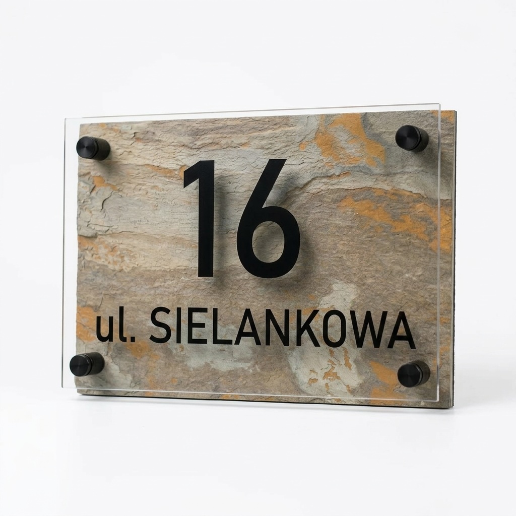 Na froncie znajduje się transparentna płyta z plexi, zamocowana na eleganckich dystansach, które tworzą efekt głębi i lekkości. Czarne, wyraźne oznaczenia numeru oraz nazwy ulicy kontrastują z naturalnym tłem, zapewniając doskonałą czytelność.