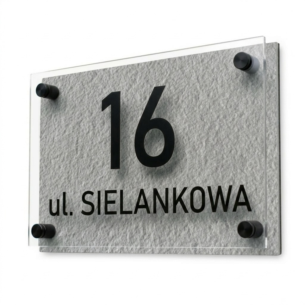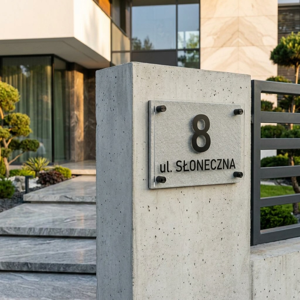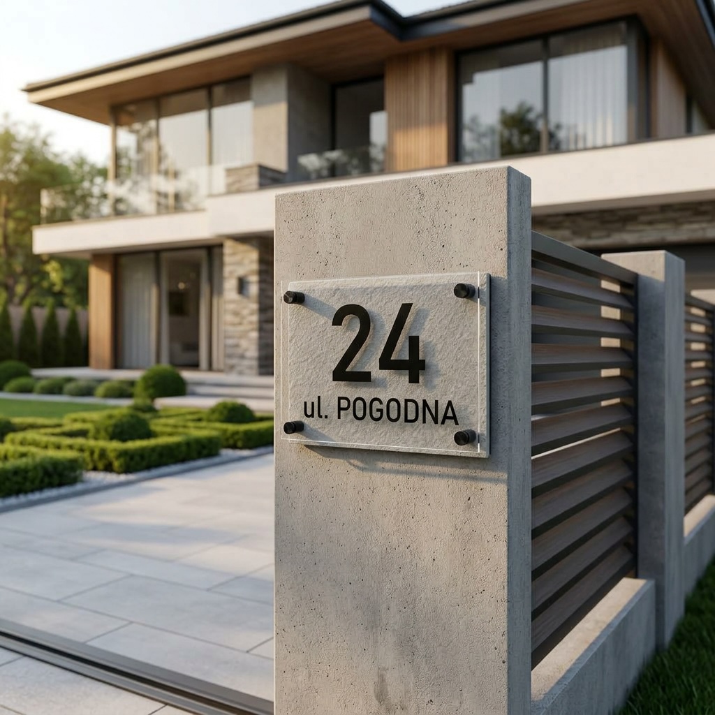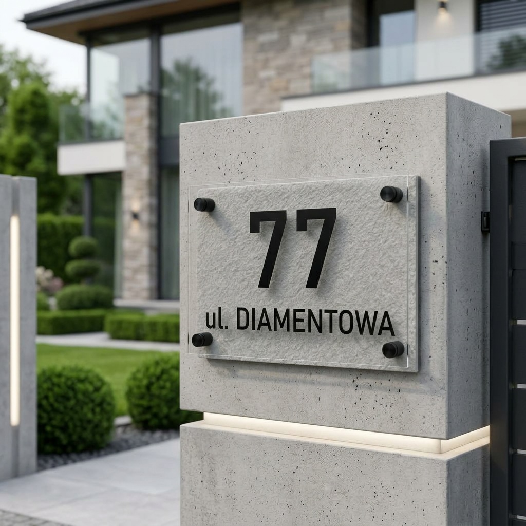 Front wykonany z przezroczystej plexi został zamocowany na dystansach, co tworzy efekt przestrzenności i podkreśla nowoczesny charakter projektu. Czarne, wyraźne oznaczenia numeru i nazwy ulicy zapewniają doskonałą czytelność, jednocześnie kontrastując z jasnym, kamiennym tłem.