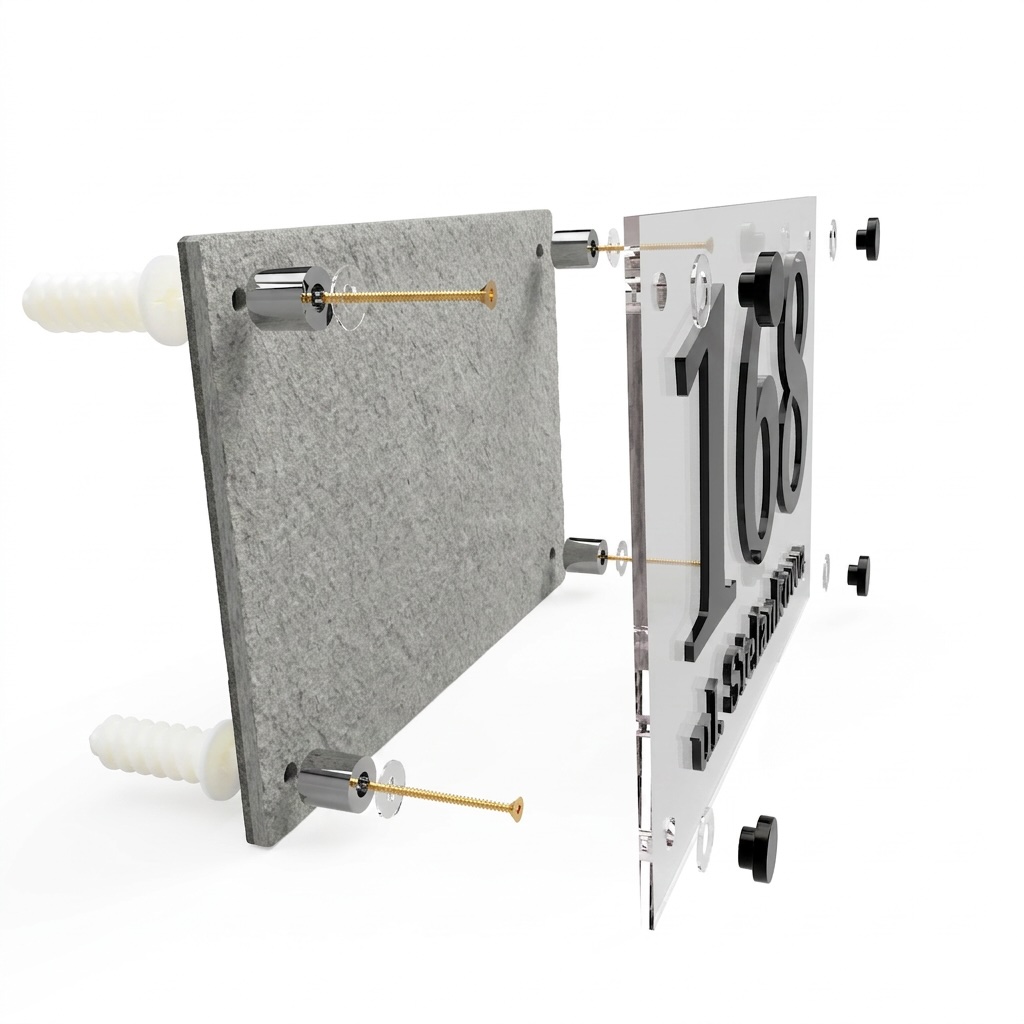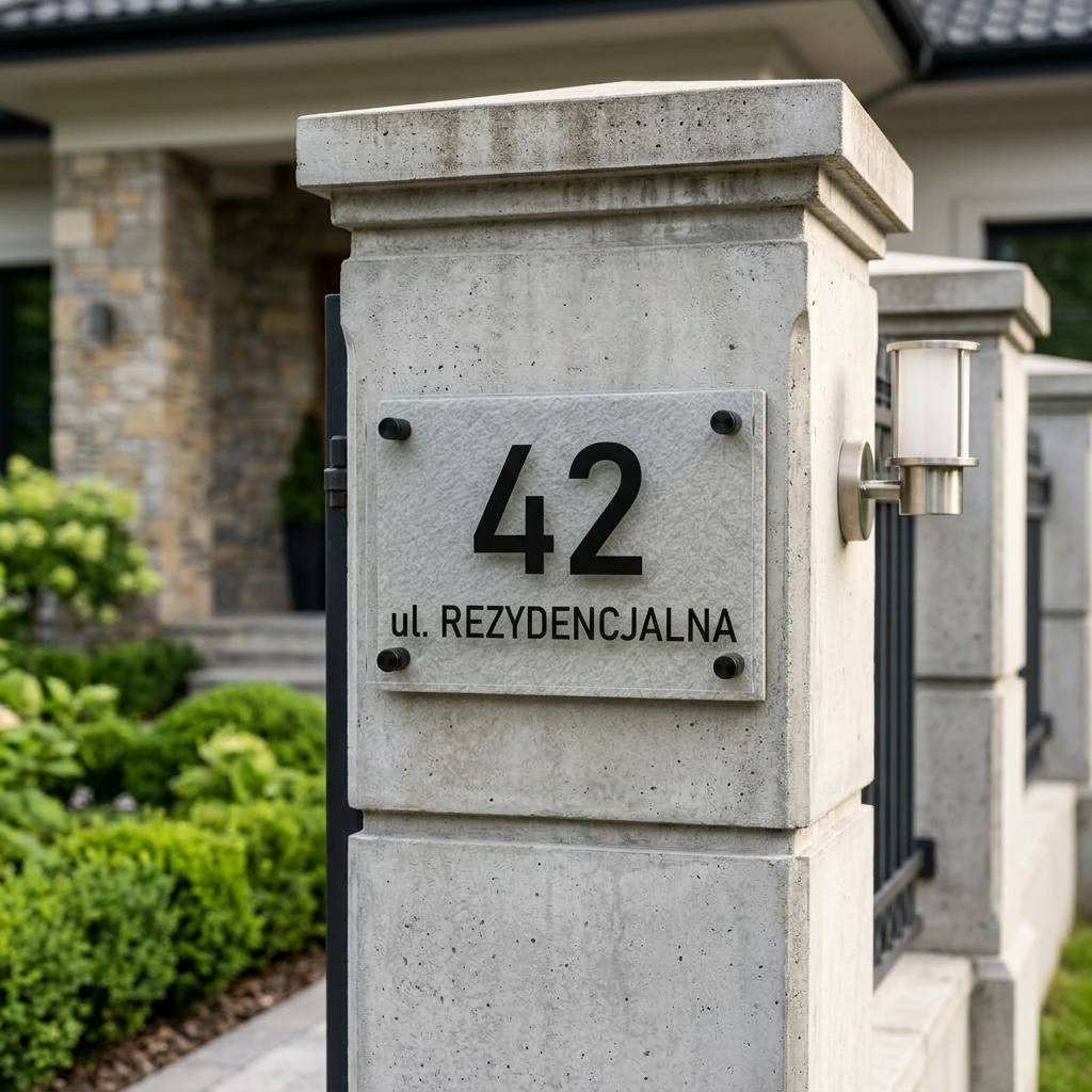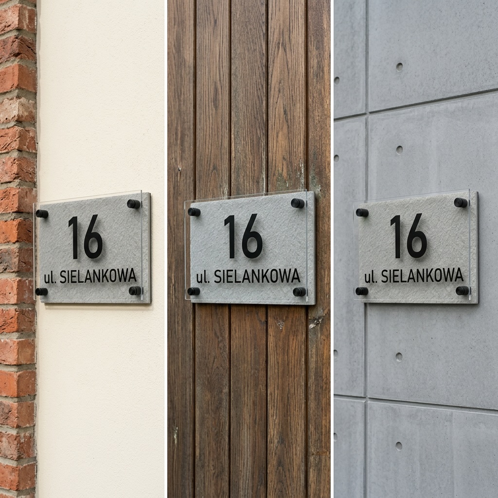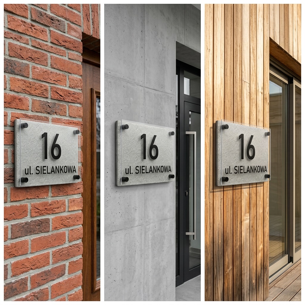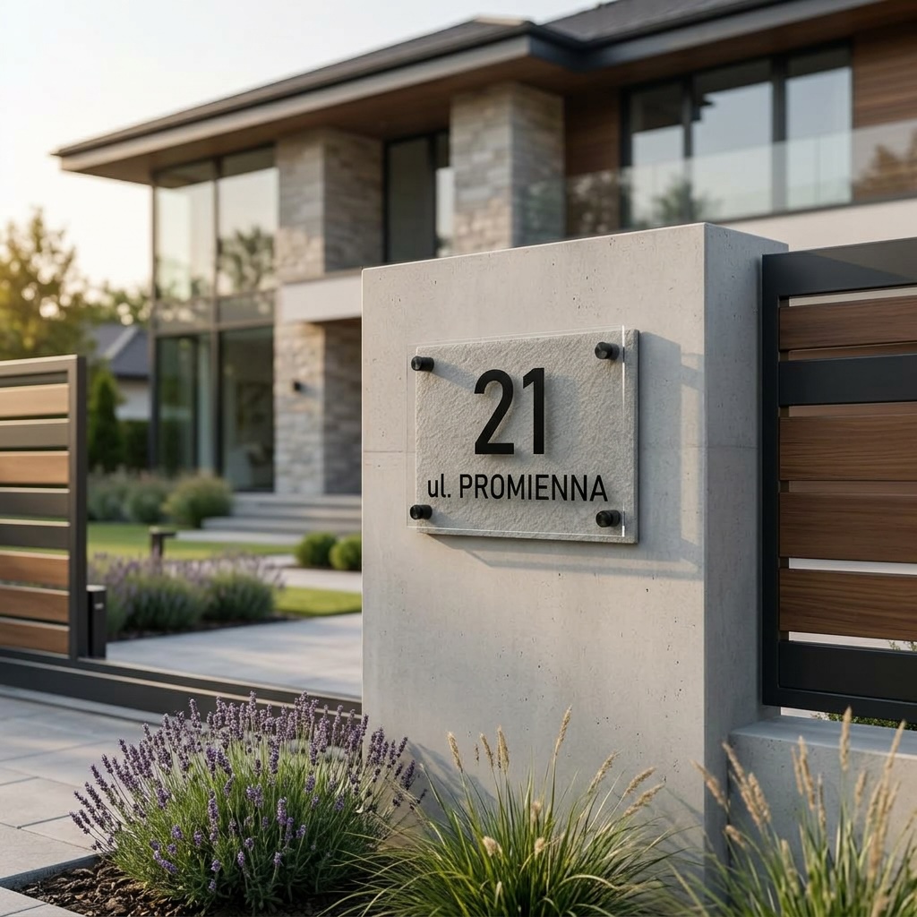 Front wykonany z przezroczystej plexi został zamocowany na dystansach, co tworzy efekt przestrzenności i podkreśla nowoczesny charakter projektu. Czarne, wyraźne oznaczenia numeru i nazwy ulicy zapewniają doskonałą czytelność, jednocześnie kontrastując z jasnym, kamiennym tłem.