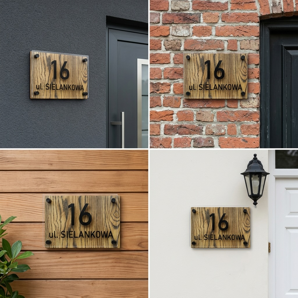 Front wykonany z przezroczystej plexi został zamocowany na dystansach, co tworzy efekt głębi i lekkości. Czarne, wyraźne oznaczenia numeru oraz nazwy ulicy doskonale kontrastują z drewnopodobnym tłem, zapewniając świetną czytelność i estetyczny wygląd.
