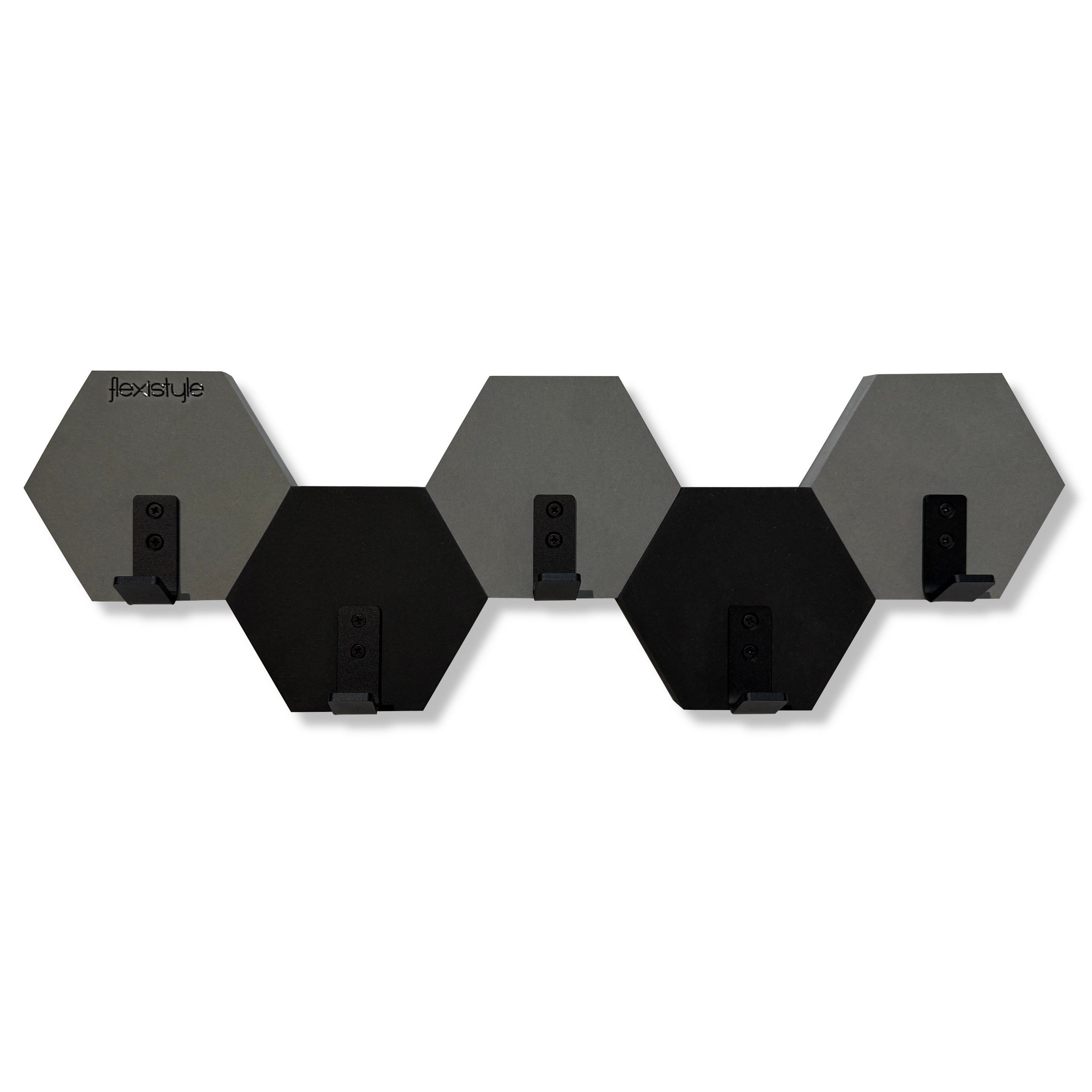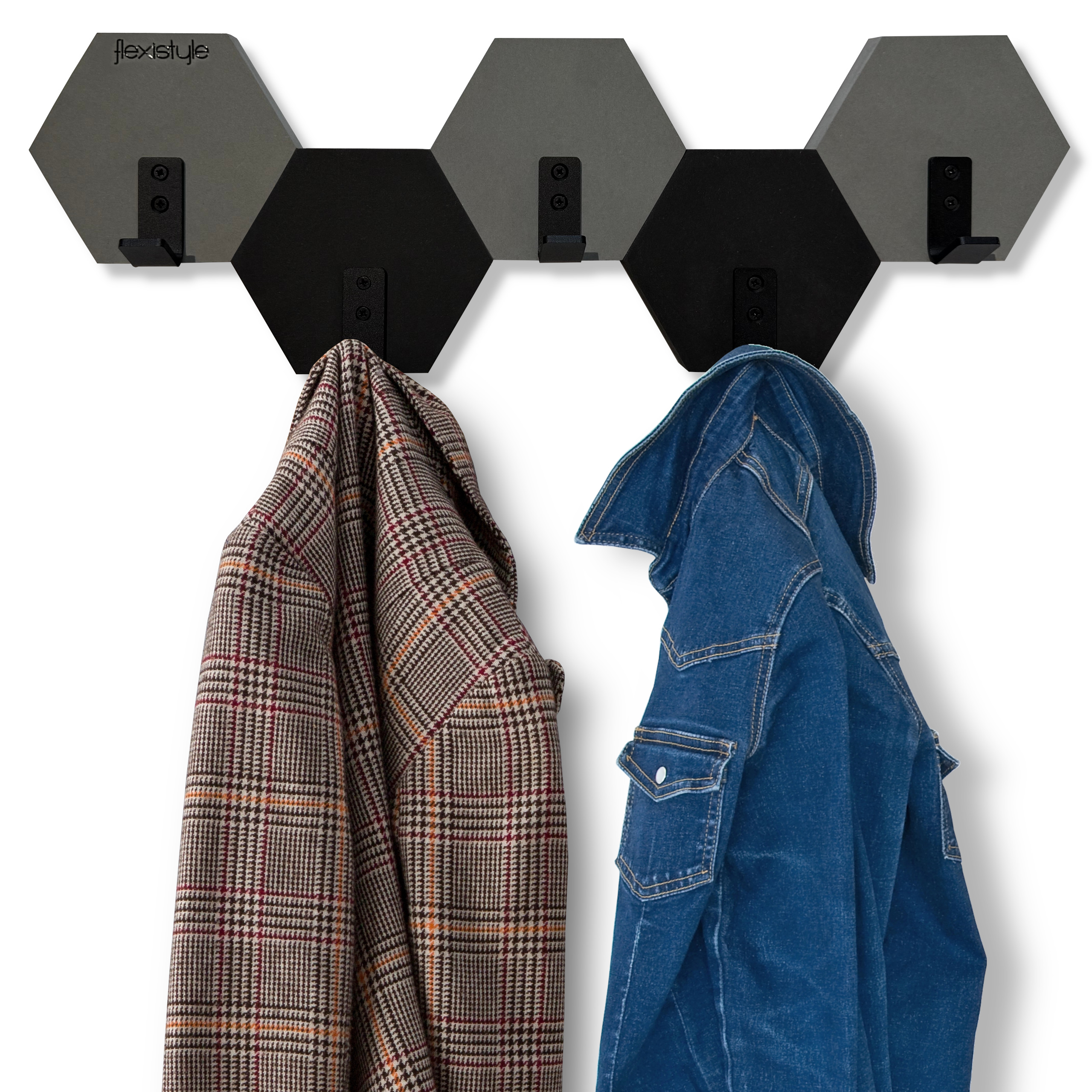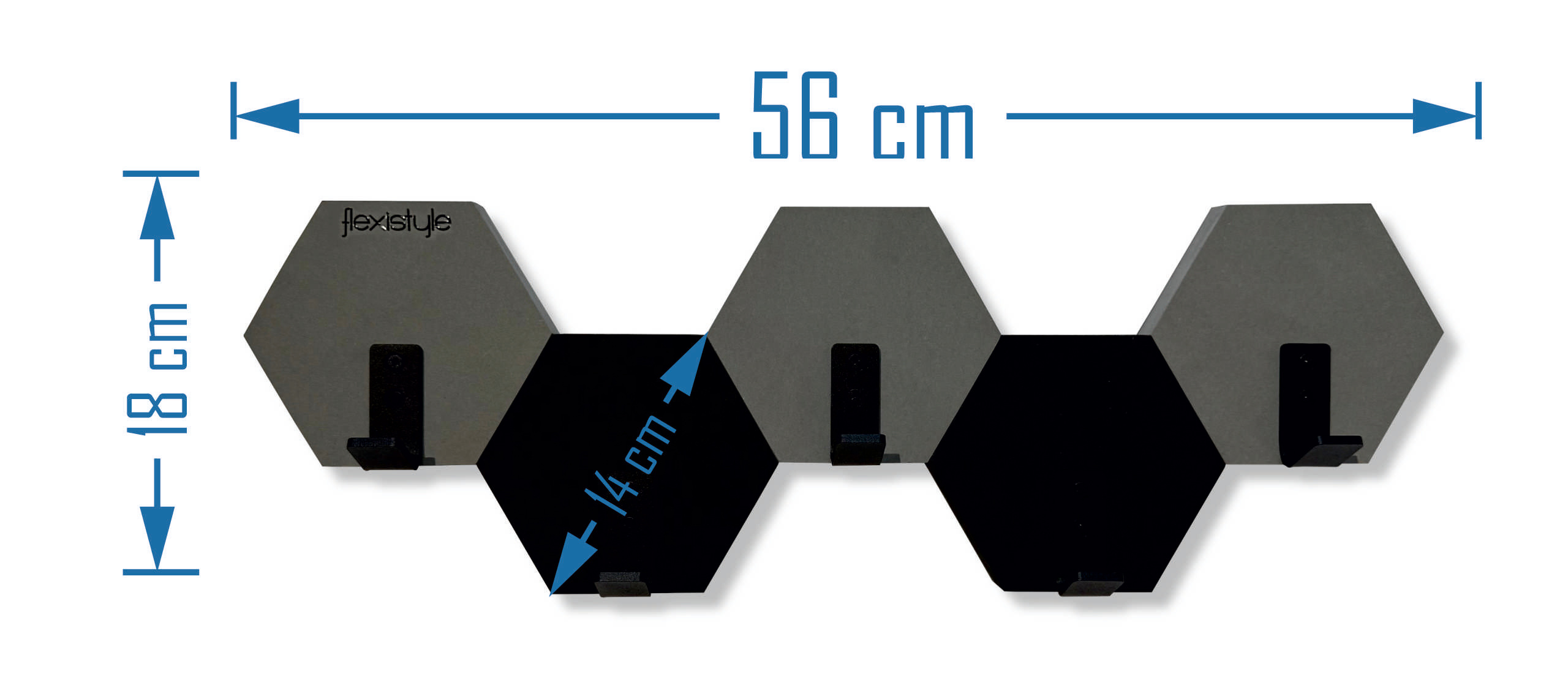 Nowoczesny wieszak ścienny Hexagon o szerokości 56 cm to połączenie funkcjonalności, naturalnych materiałów i minimalistycznego designu. Składa się z pięciu geometrycznych elementów w kształcie heksagonów, które tworzą spójną i estetyczną całość idealną do przedpokoju, garderoby lub biura.