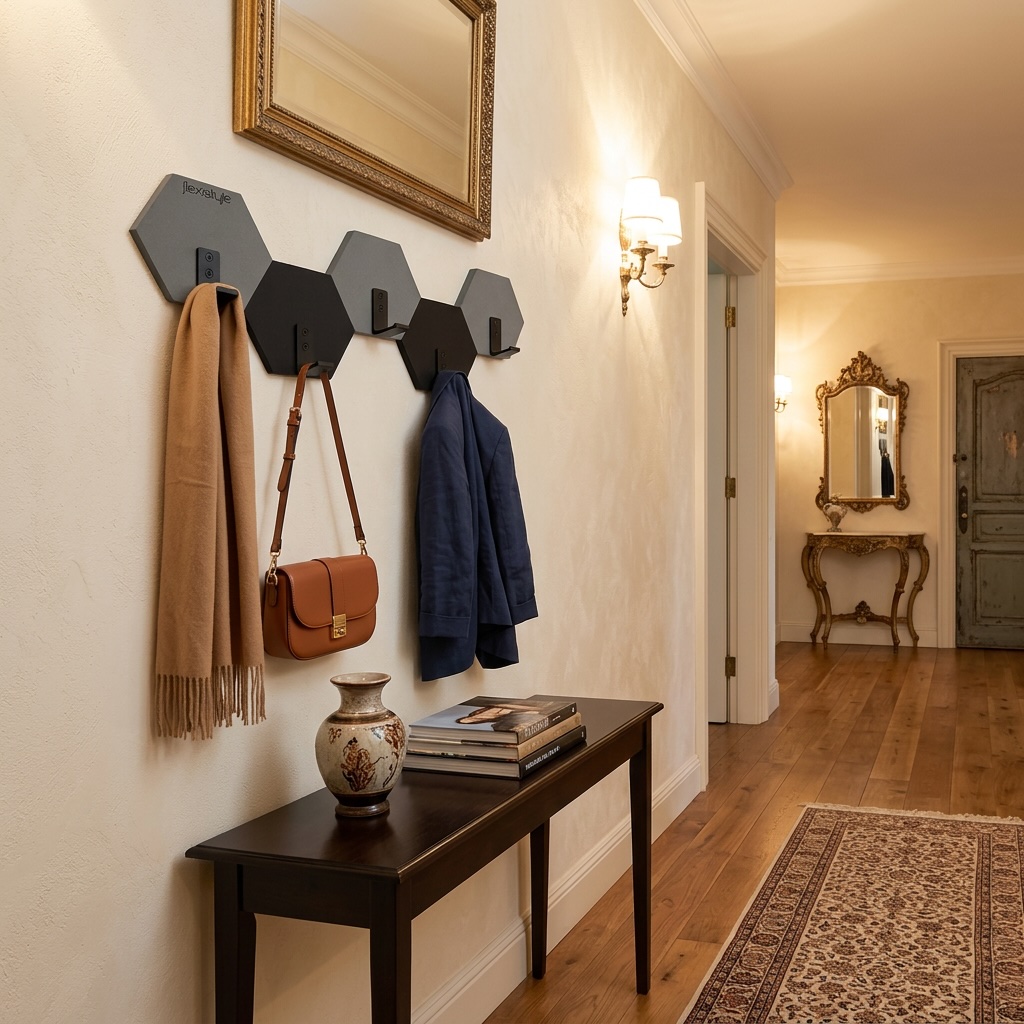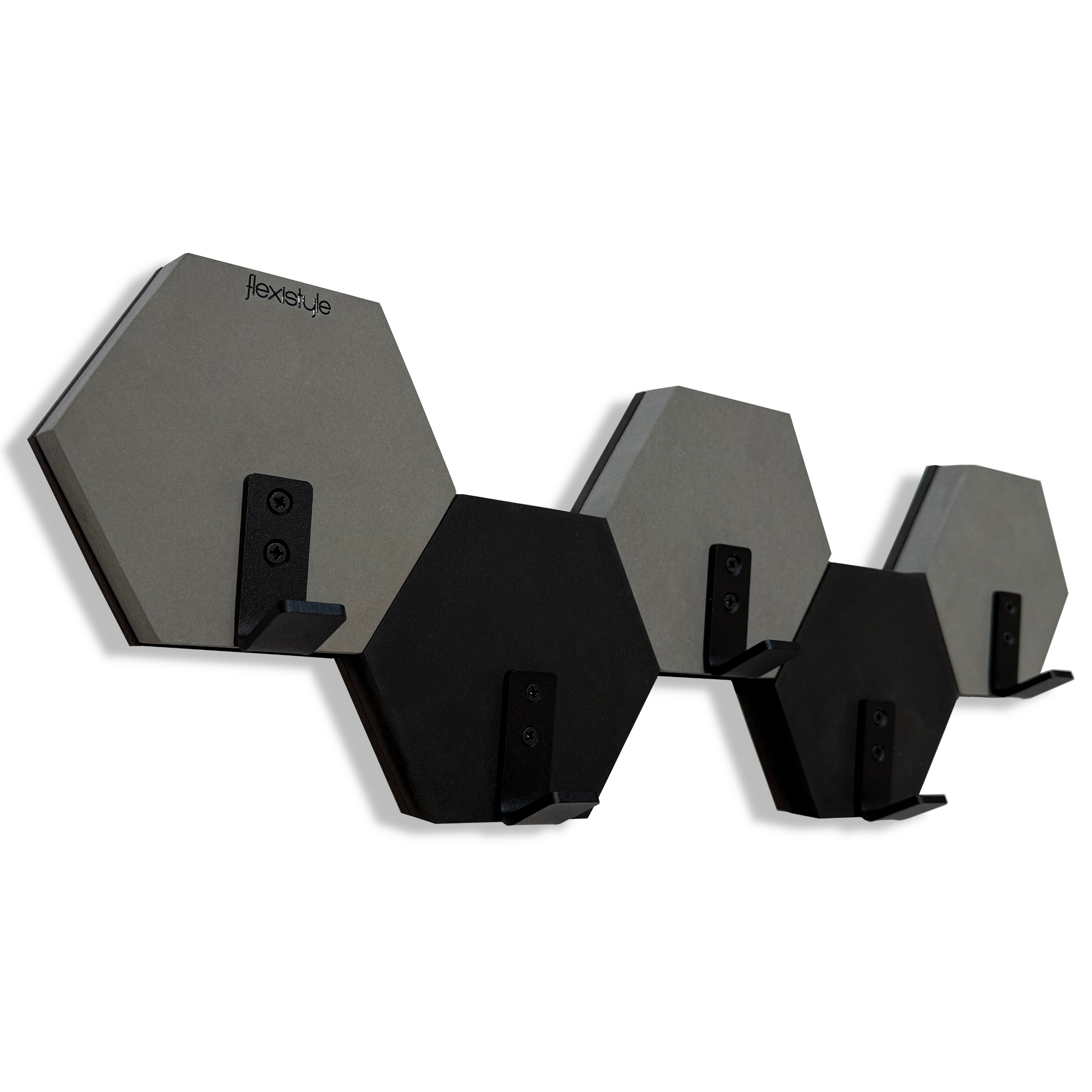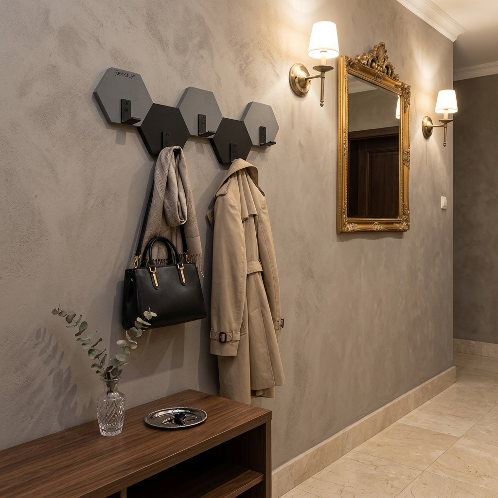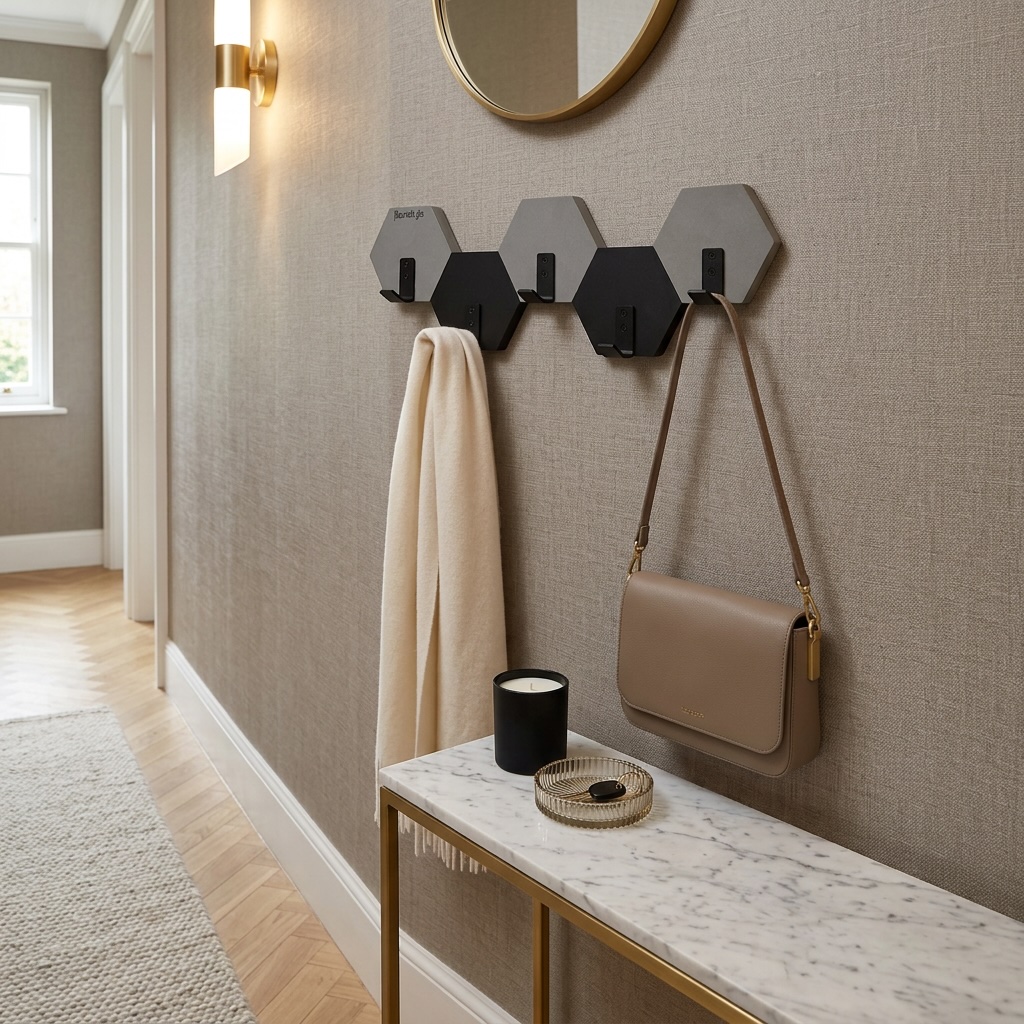Nowoczesny wieszak ścienny Hexagon o szerokości 56 cm to połączenie funkcjonalności, naturalnych materiałów i minimalistycznego designu. Składa się z pięciu geometrycznych elementów w kształcie heksagonów, które tworzą spójną i estetyczną całość idealną do przedpokoju, garderoby lub biura.