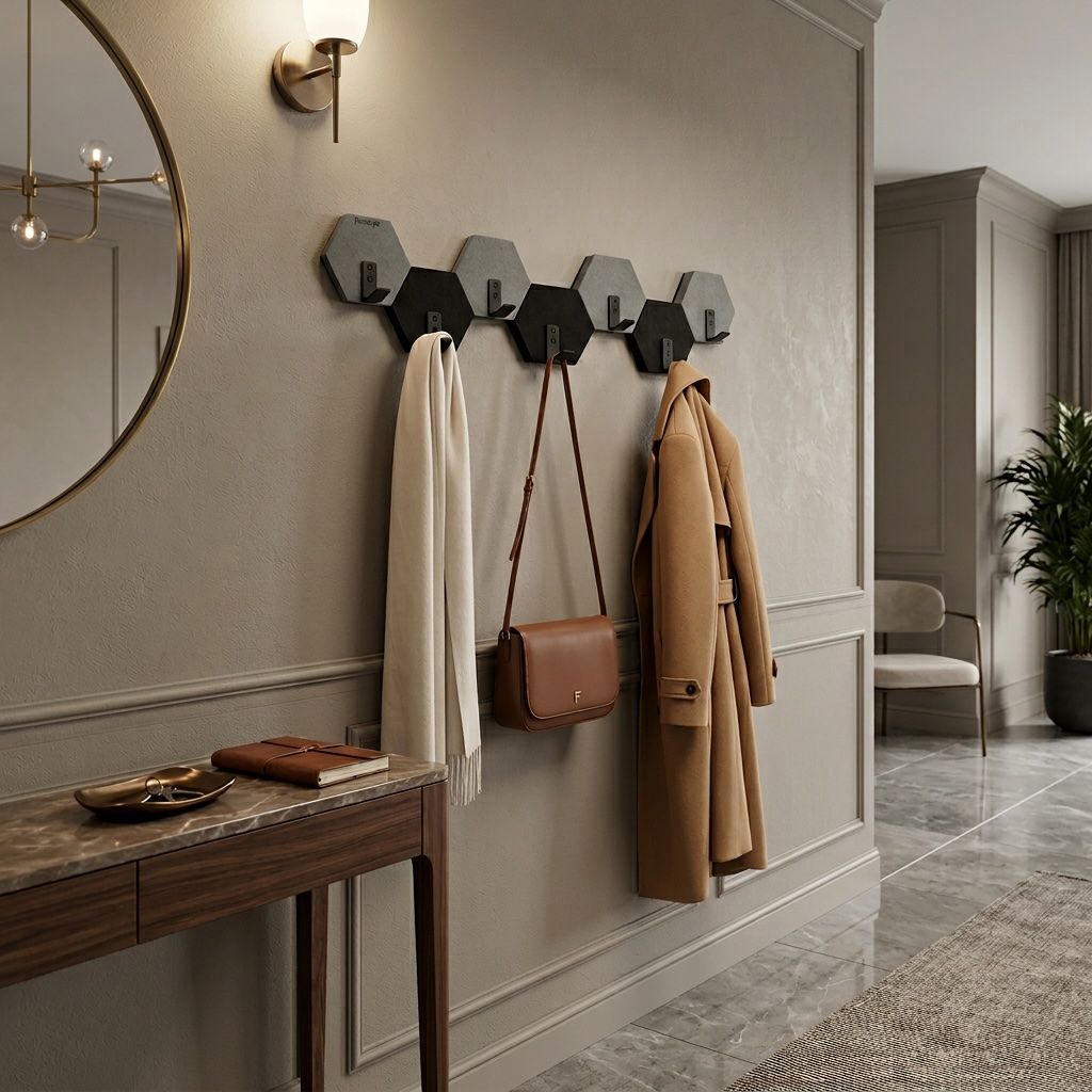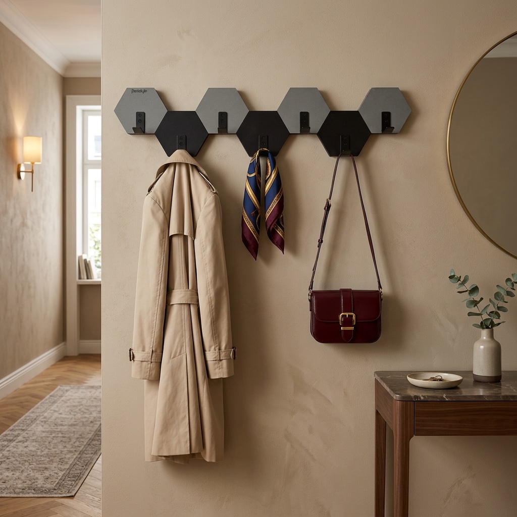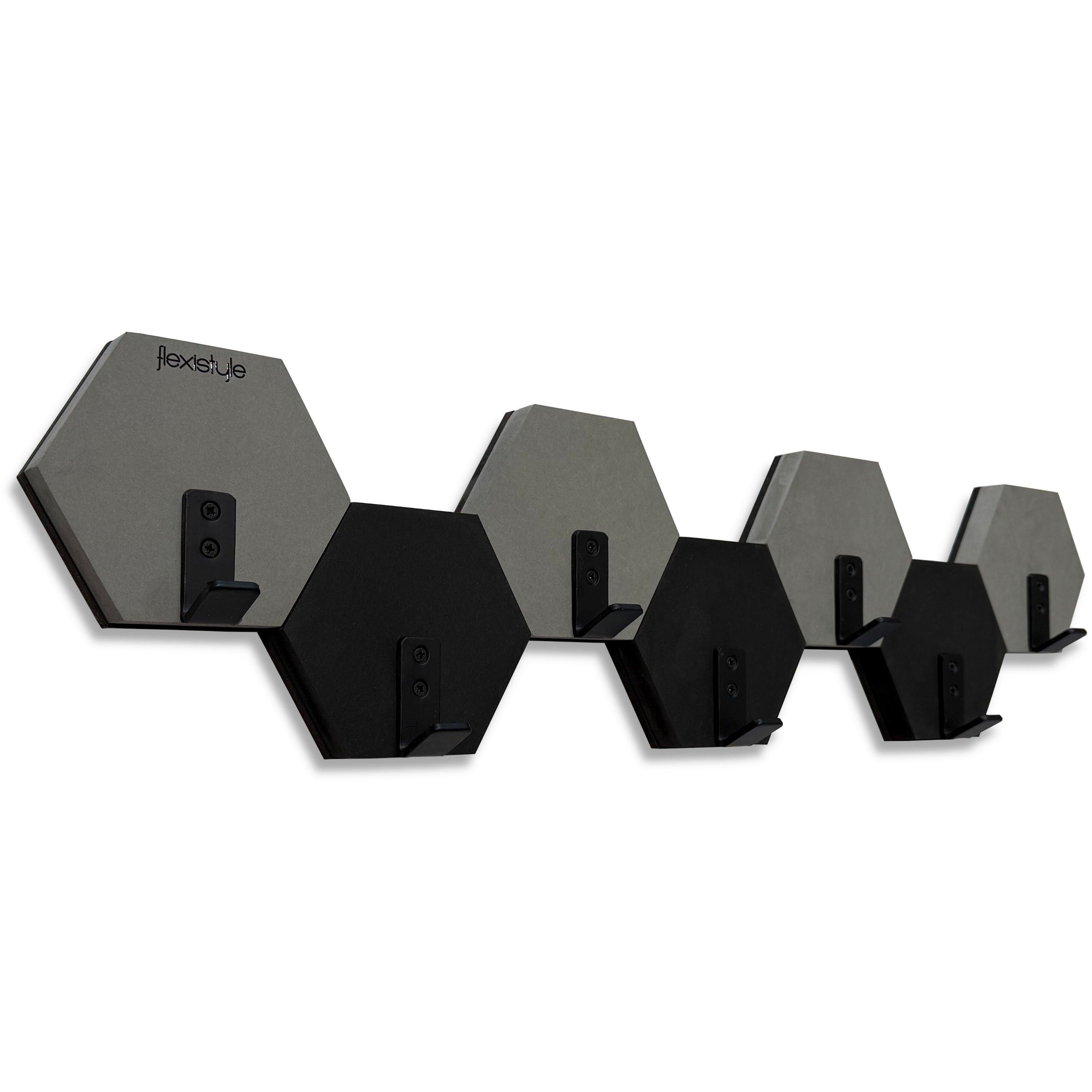 Nowoczesny wieszak ścienny w formie heksagonów, który łączy funkcjonalność z efektownym designem. Geometryczny układ inspirowany plastrem miodu oraz naprzemienne zestawienie kolorów czarnego i szarego nadają wnętrzu nowoczesny, dynamiczny charakter.