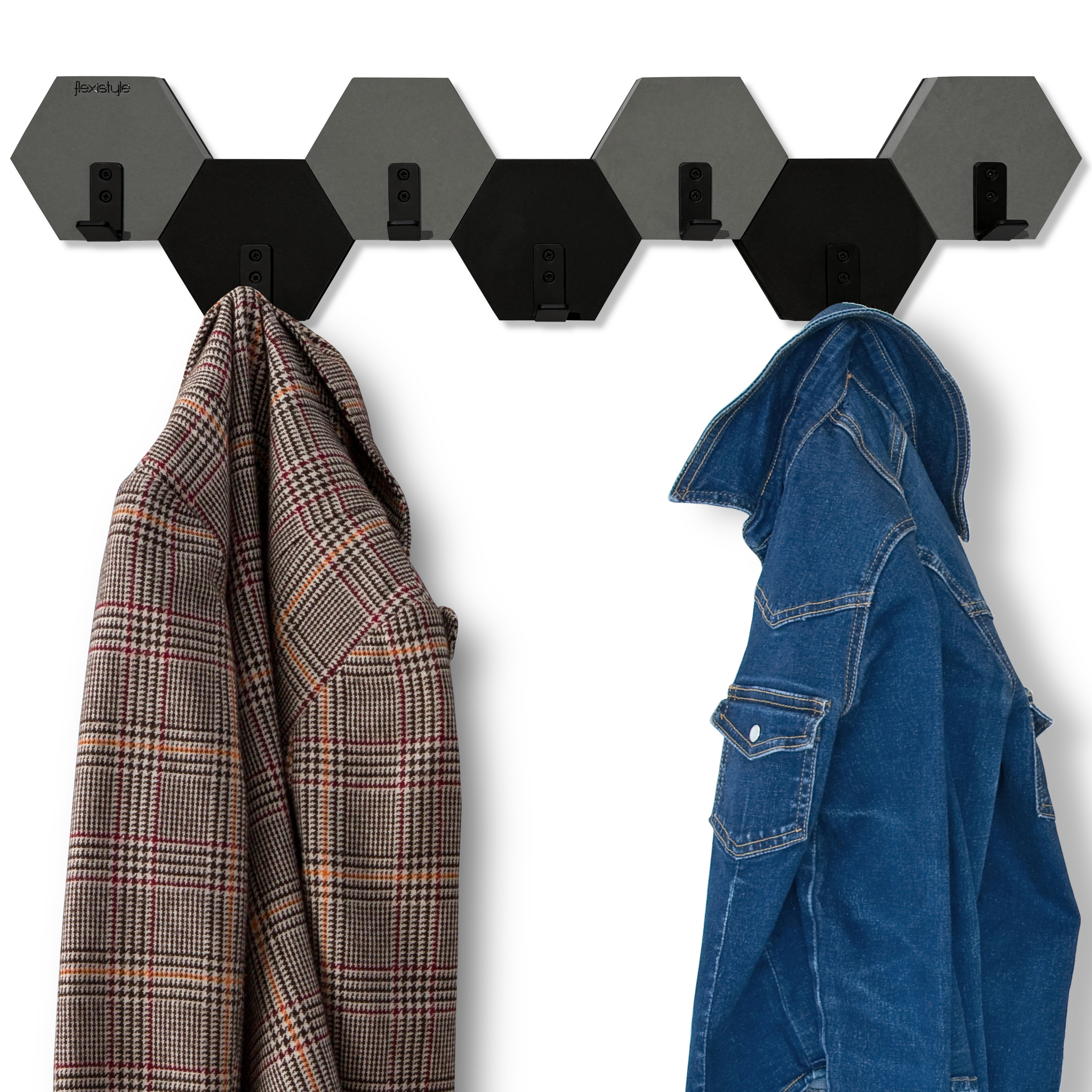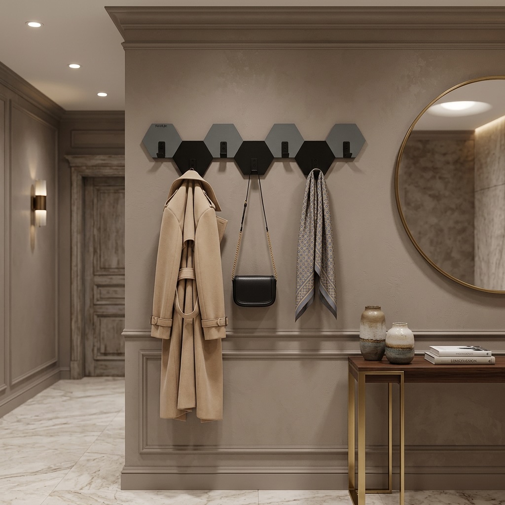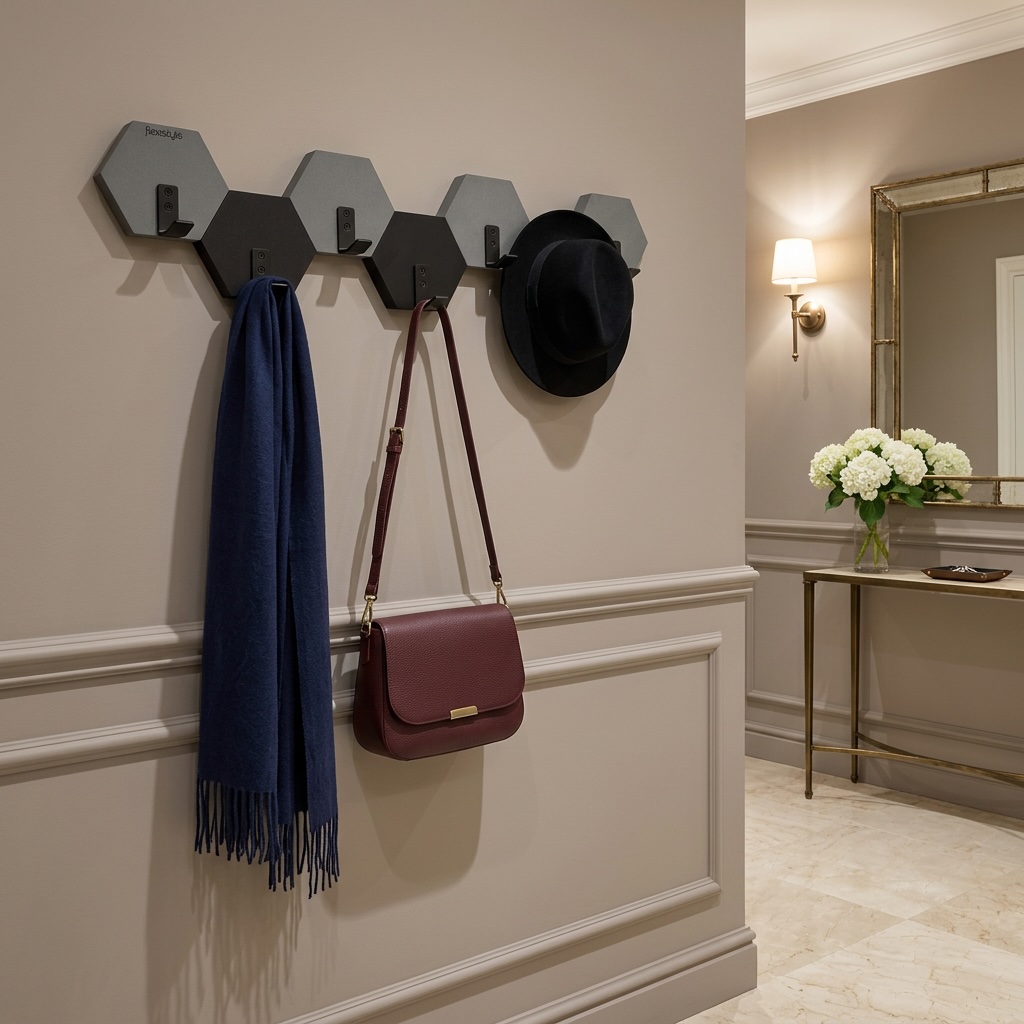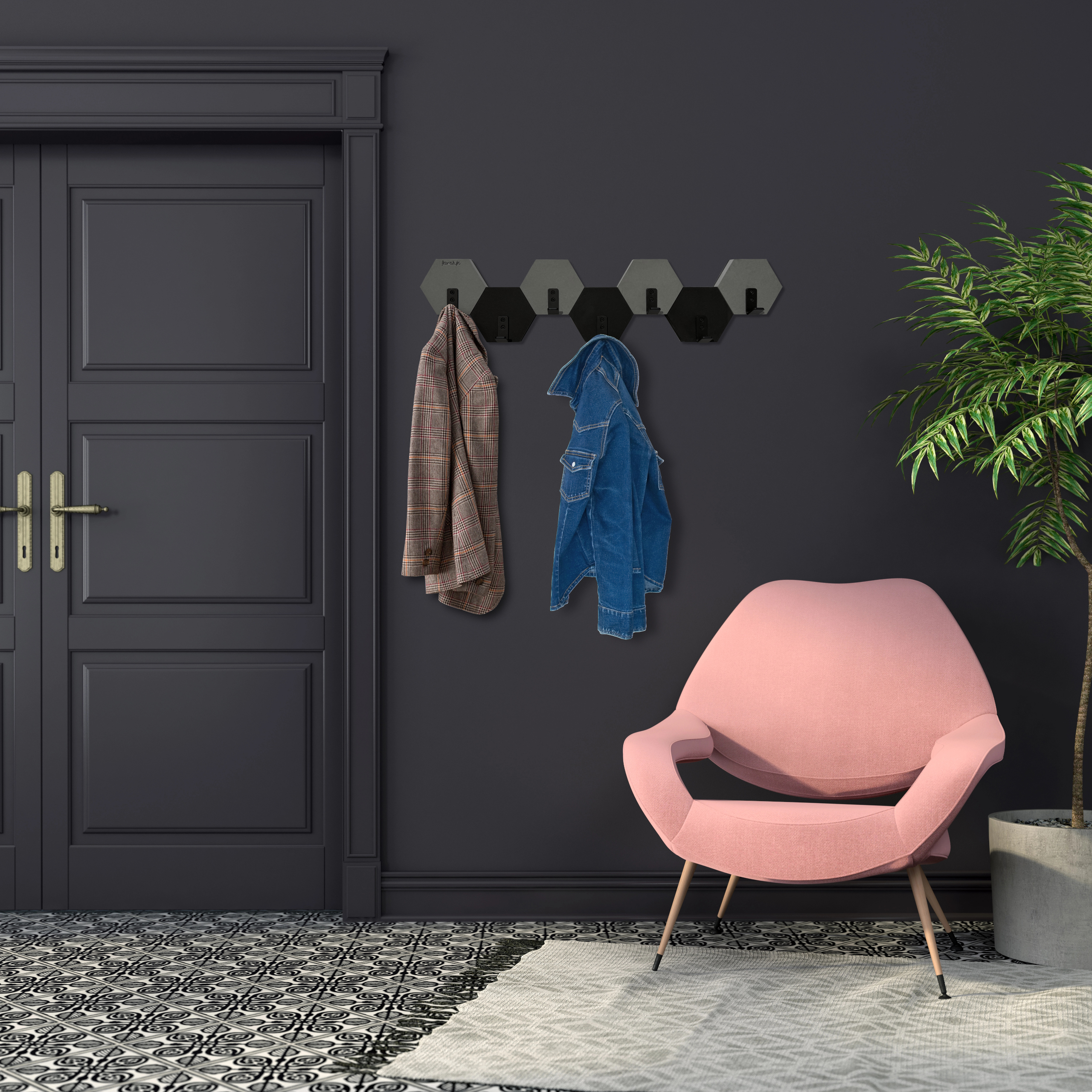 Nowoczesny wieszak ścienny w formie heksagonów, który łączy funkcjonalność z efektownym designem. Geometryczny układ inspirowany plastrem miodu oraz naprzemienne zestawienie kolorów czarnego i szarego nadają wnętrzu nowoczesny, dynamiczny charakter.