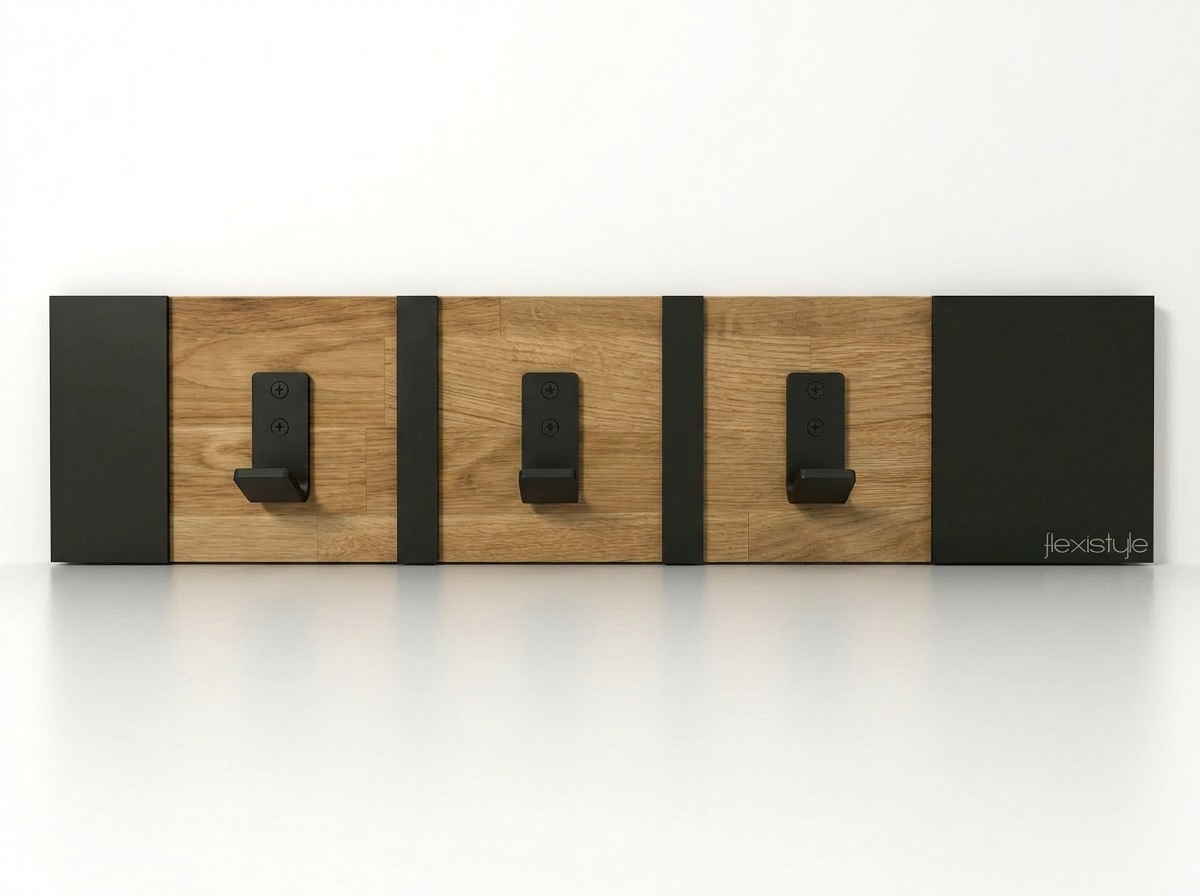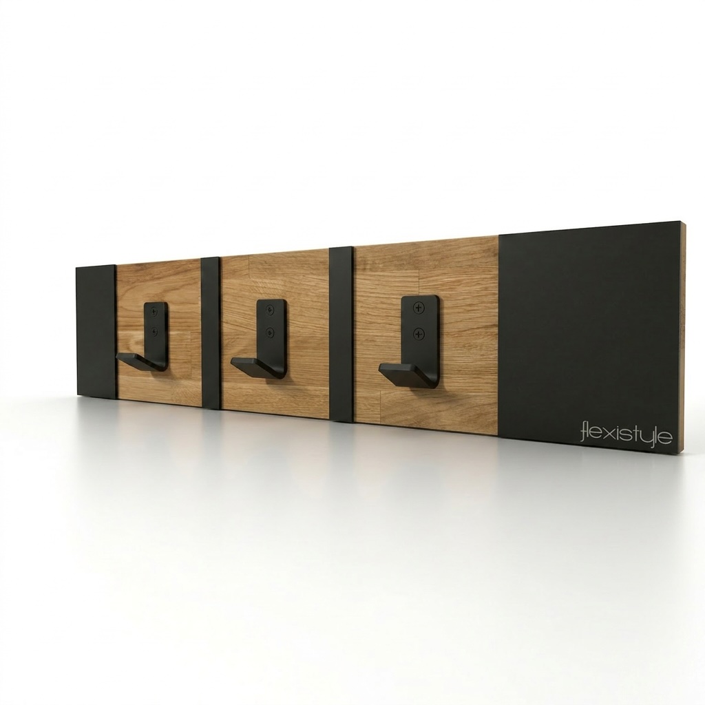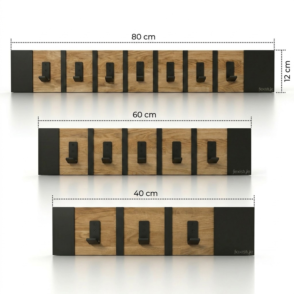 Połączenie ciepłego drewna dębowego z czarnymi metalowymi elementami tworzy spójną i elegancką całość. Wieszak doskonale wpisuje się w aranżacje loftowe industrialne oraz nowoczesne.