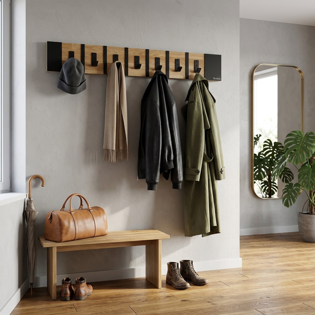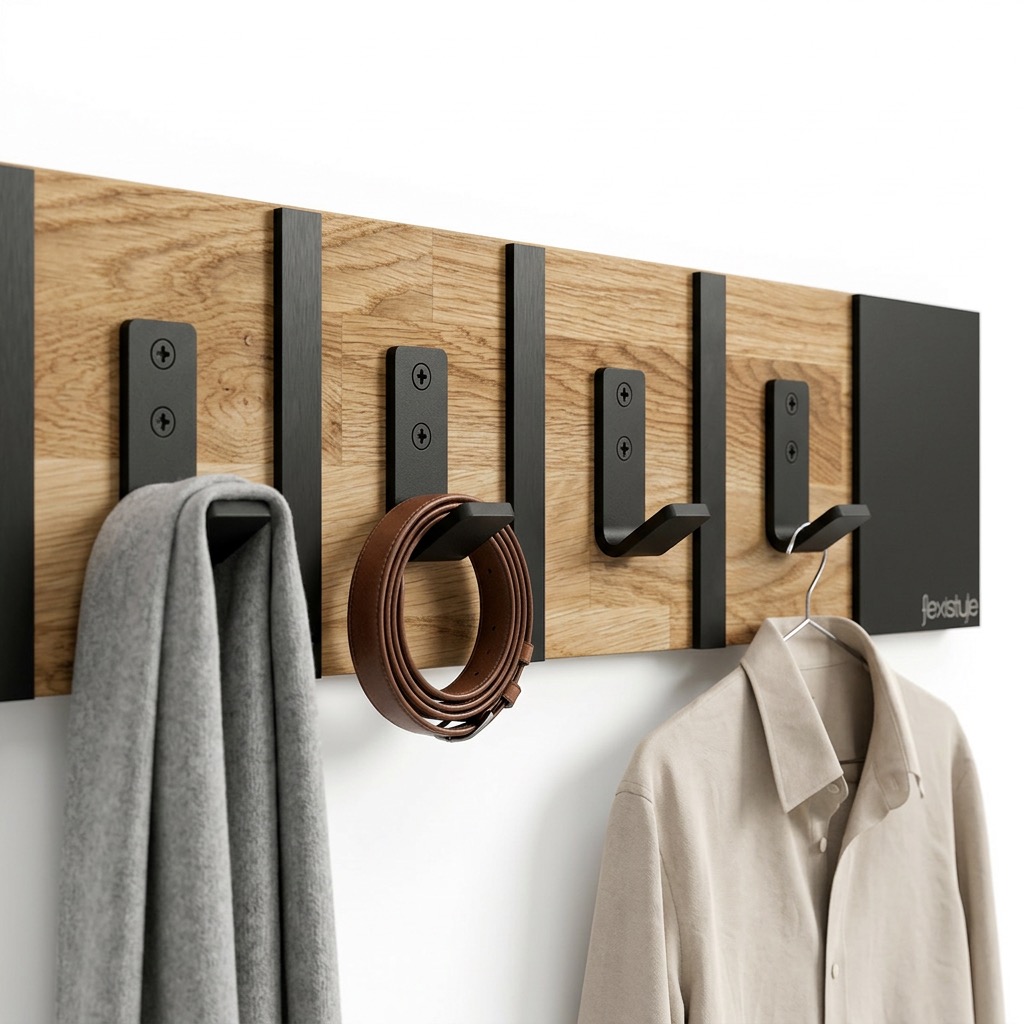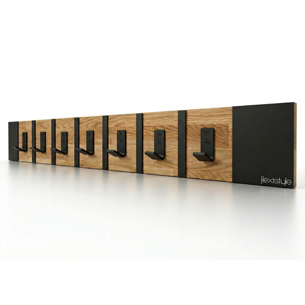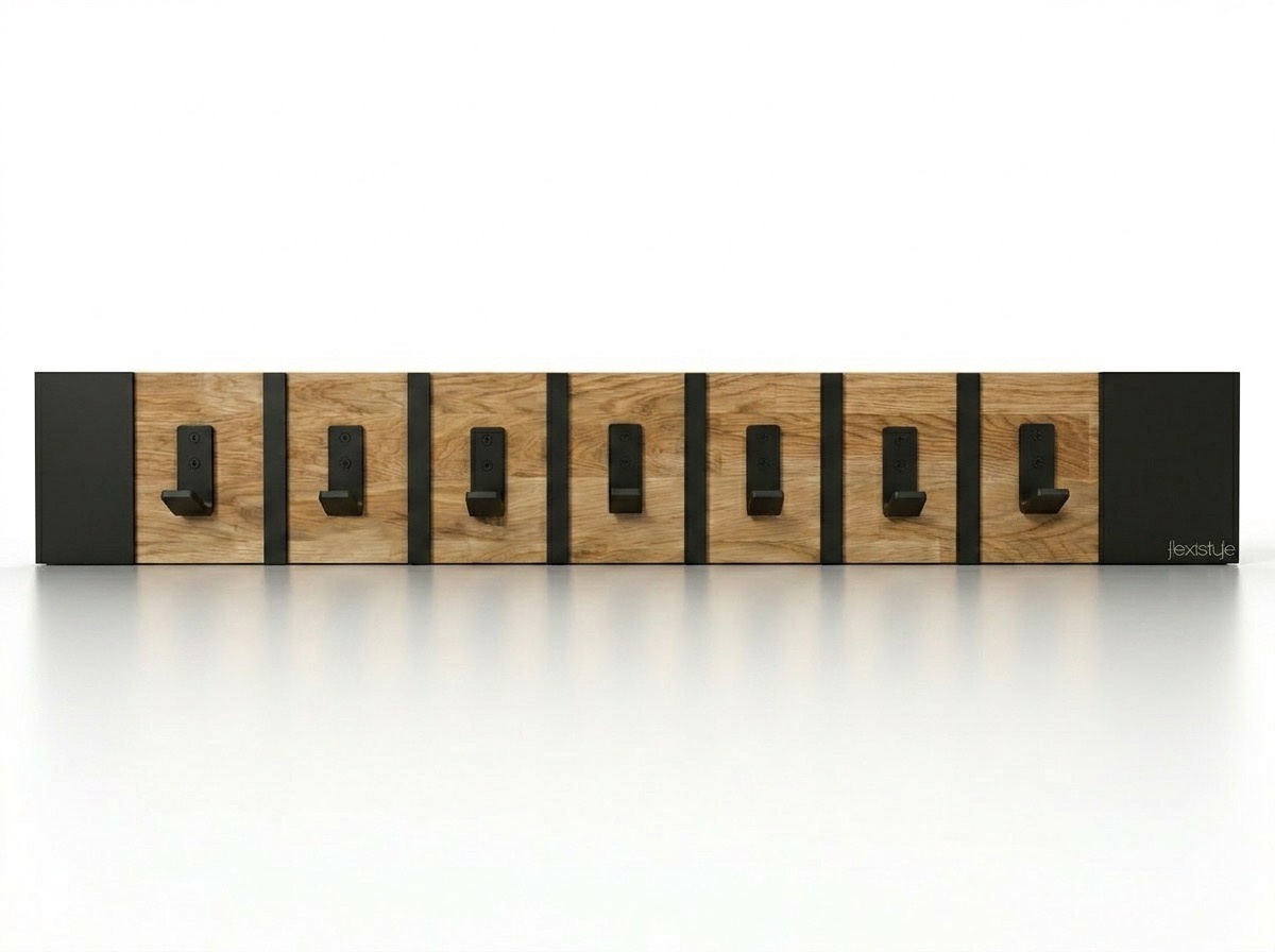 Połączenie ciepłego drewna dębowego z czarnymi metalowymi elementami tworzy spójną i elegancką całość. Wieszak doskonale wpisuje się w aranżacje loftowe industrialne oraz nowoczesne.