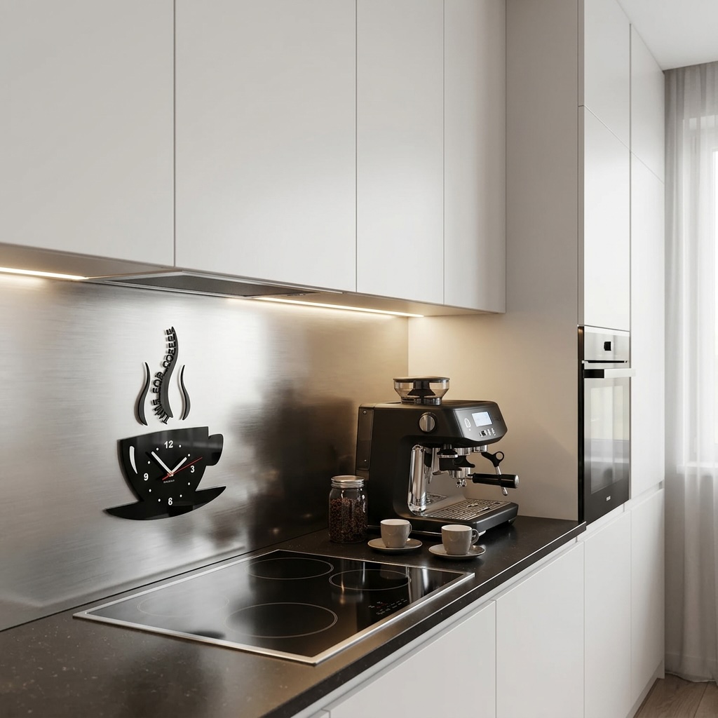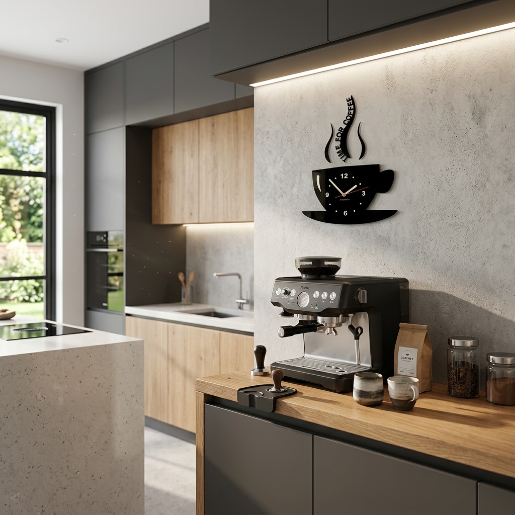 Nowoczesny zegar kuchenny w kształcie filiżanki to wyjątkowe połączenie funkcjonalności i dekoracji. Idealnie sprawdzi się w kuchni, jadalni lub kawiarni, nadając wnętrzu przytulny i stylowy charakter.