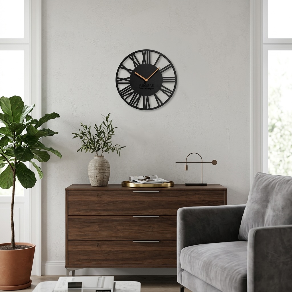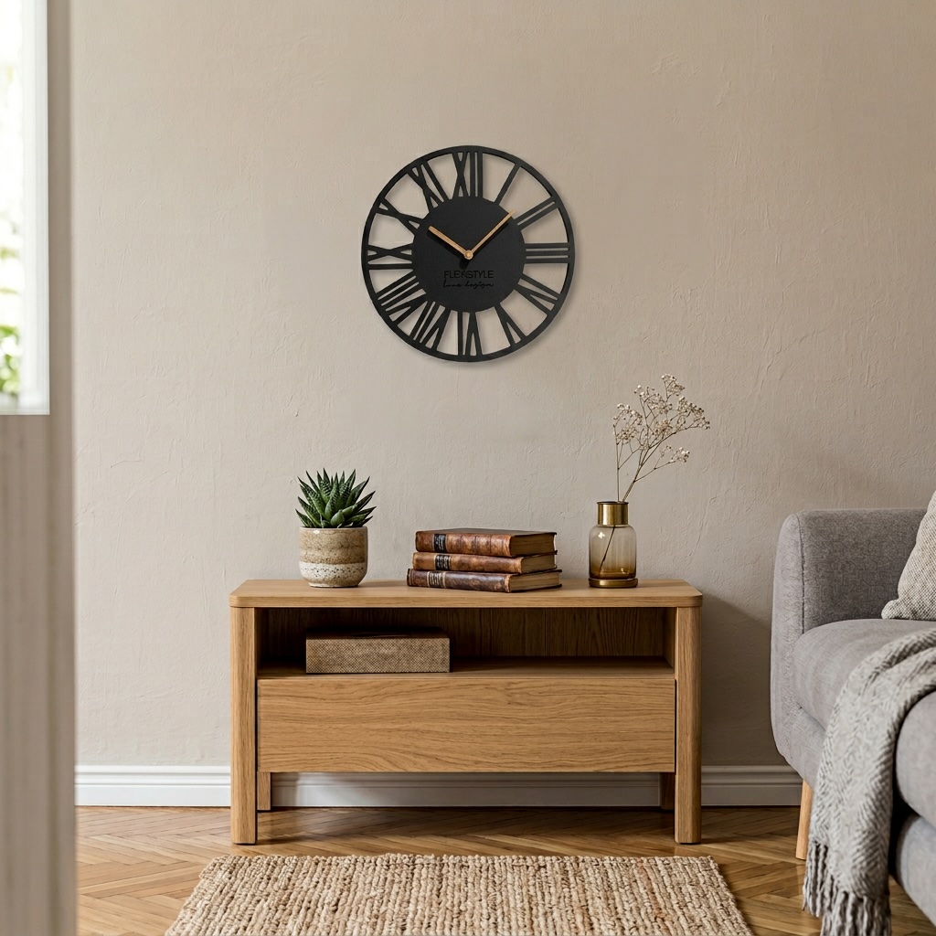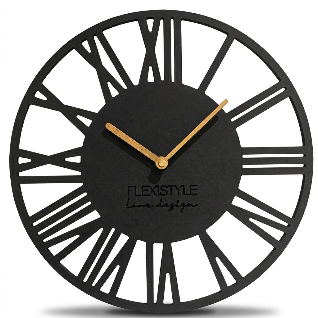 Zegar prezentuje drewniane wskazówki, które w połączeniu z czarnym tłem tworzą elegancką kompozycję. Cyfry rzymskie wycięte w tarczy zegara dodają mu wyjątkowego uroku.