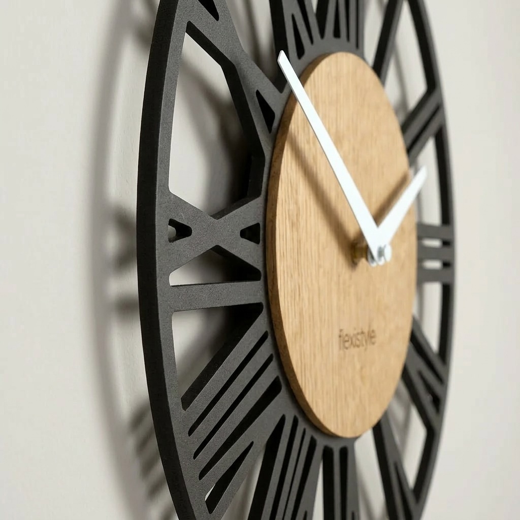 Zjawiskowy Kontrast: Piccolo Wood Loft wyróżnia się niezwykłym zestawieniem elementów - białe wskazówki, precyzyjnie kontrastujące z głęboką czernią tarczy, tworzą niepowtarzalny efekt wizualny. Klasyczne wskazówki rzymskie dodają zegarowi szczyptę klasy i elegancji.