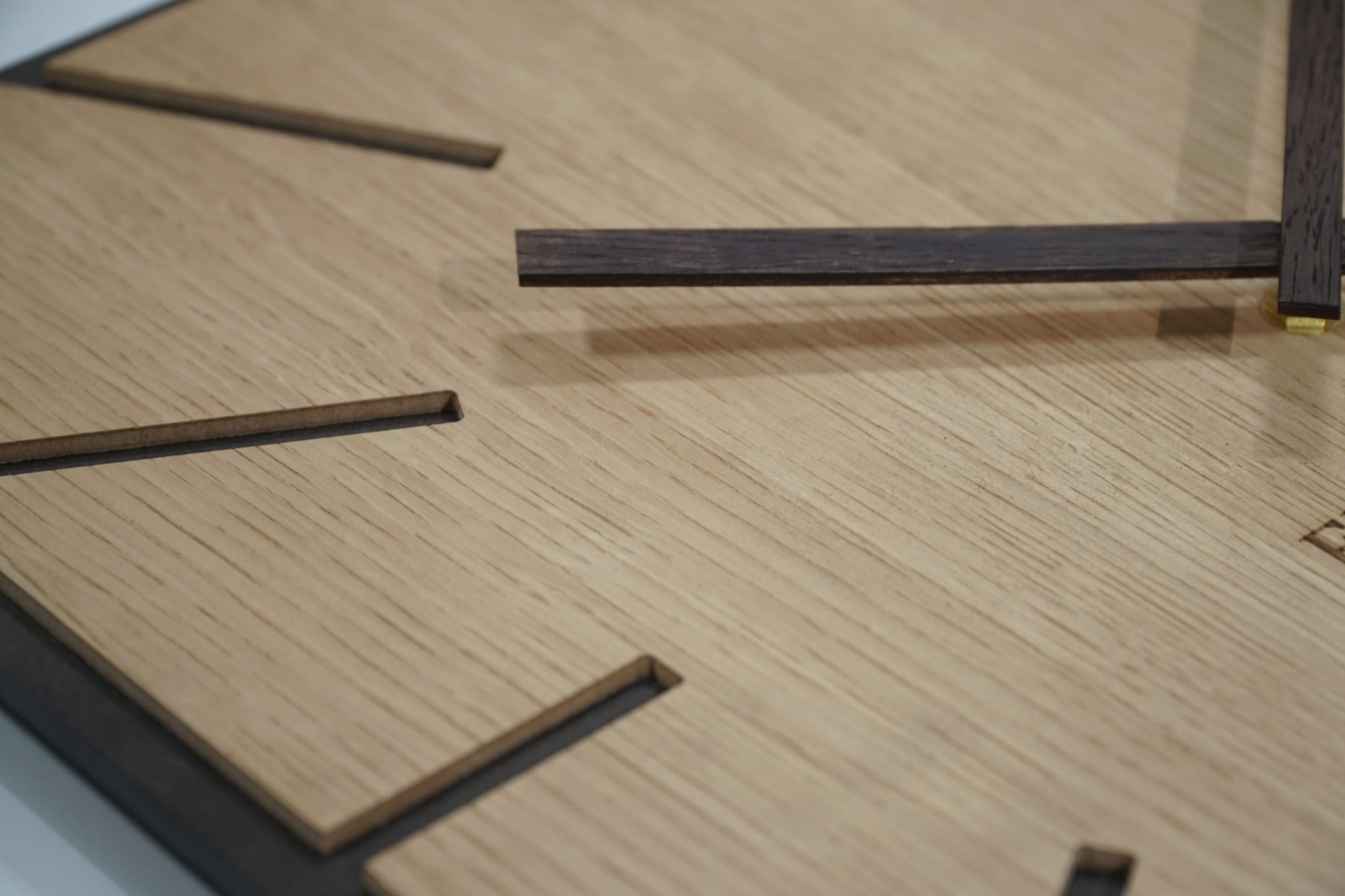 - Naturalna okleina dębu naturalnego dodaje szlachetności i elegancji. Drewniane wskazówki idealnie komponują z całością. Minimalistyczny wygląd idealnie wpasuje się do nowoczesnych wnętrz.