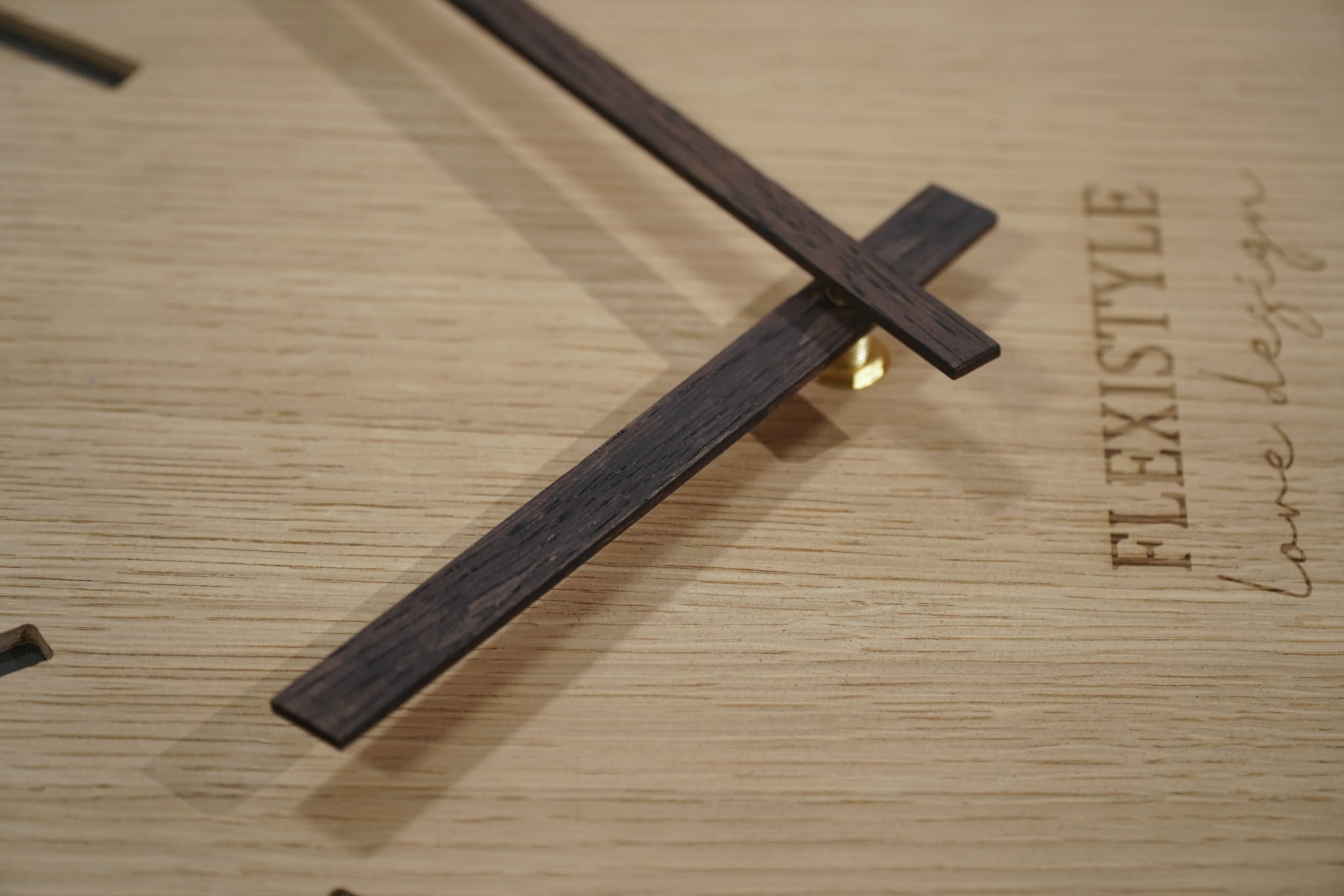 Drewniane Wskazówki w Kolorze Brązowym: Wskazówki zegara są drewniane i utrzymane w brązowym odcieniu, doskonale współgrając z dębową strukturą frontu.