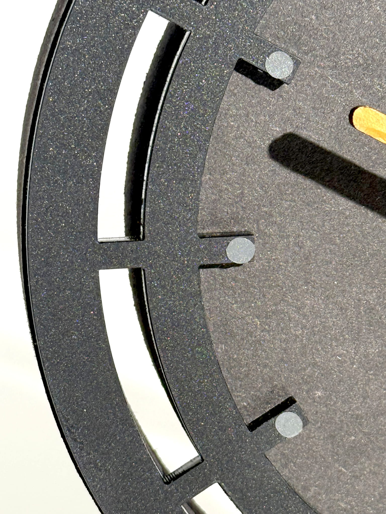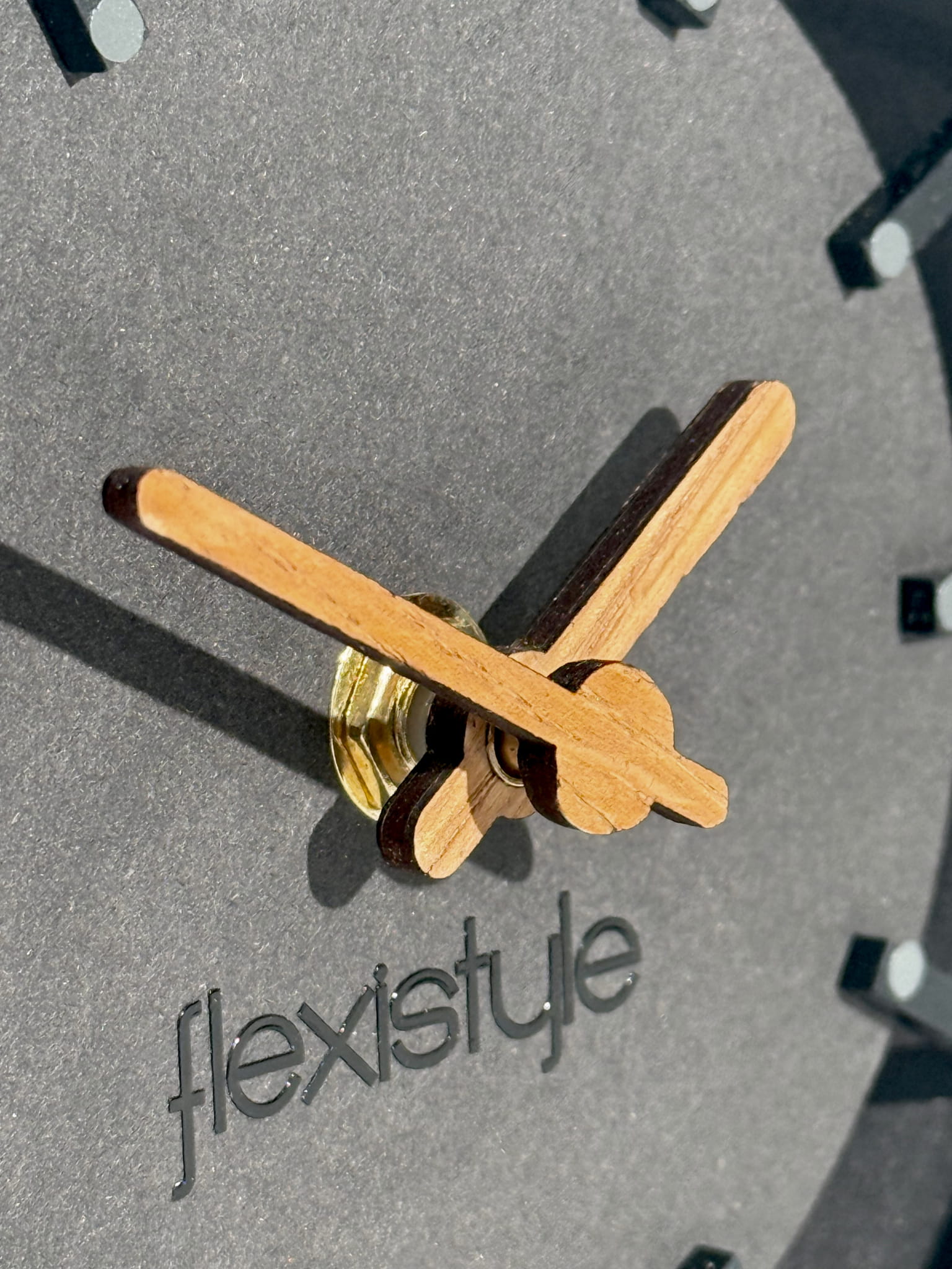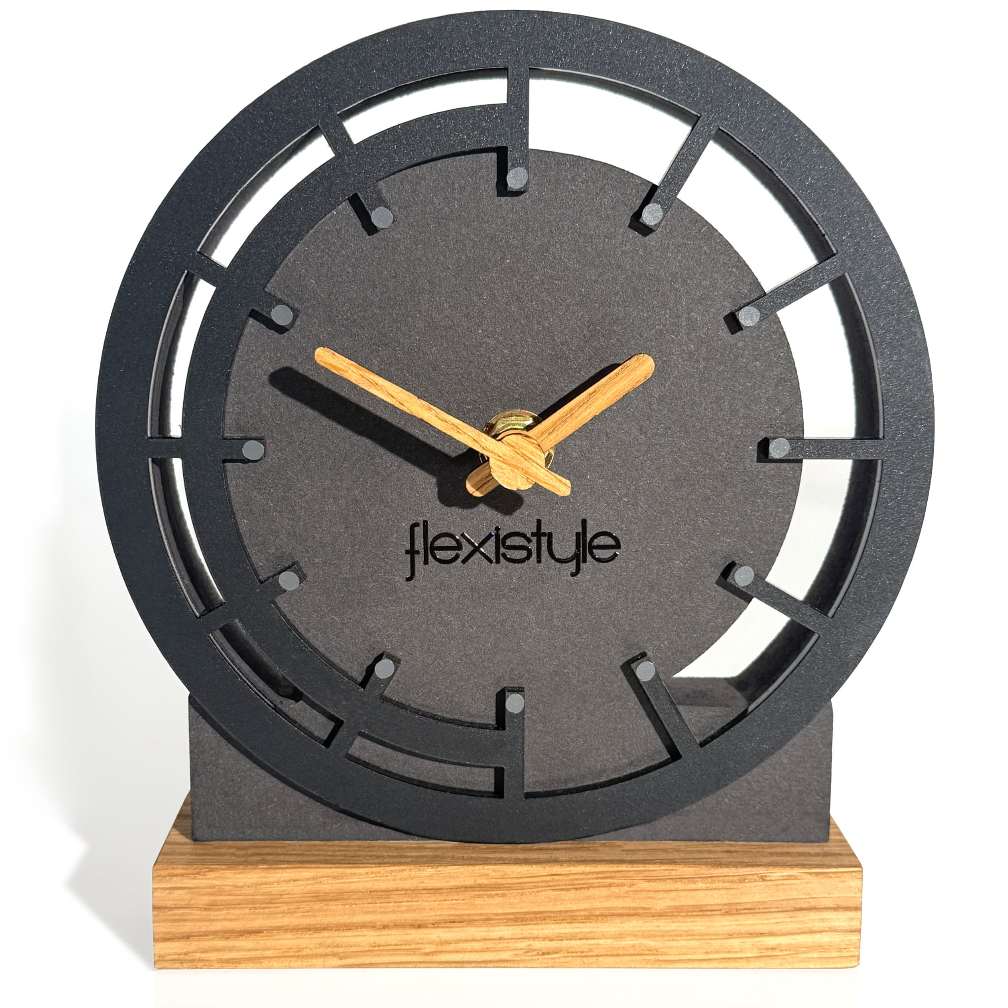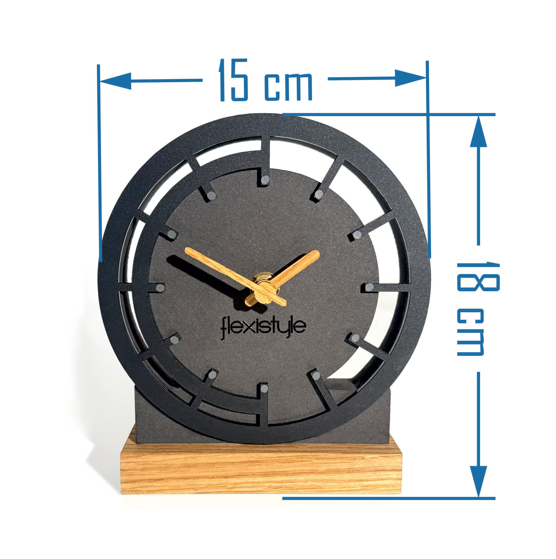 Podstawka zegara wykonana jest z naturalnego dębu, co podkreśla jego wyjątkowy charakter. Wskazówki z okleiny dębowej harmonijnie współgrają z dębowymi elementami dekoracyjnymi, a czarna obudowa z MDF-u dodaje całości nowoczesnego wyglądu. Połączenie tych materiałów nadaje produktowi wyjątkową elegancję i ekologiczny charakter.